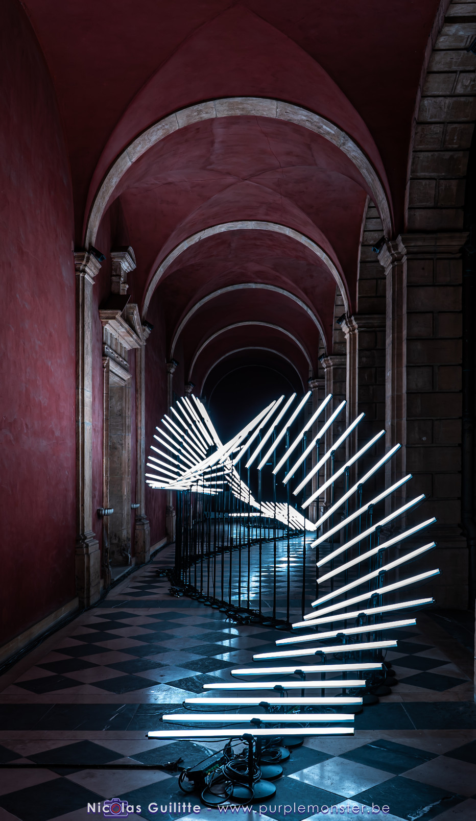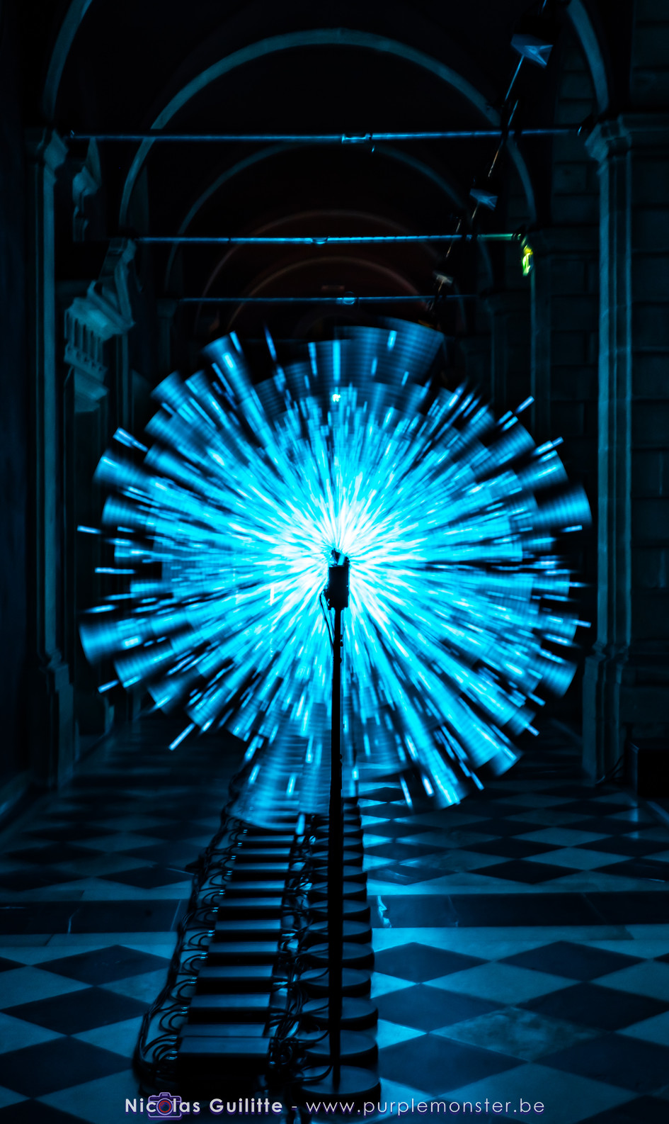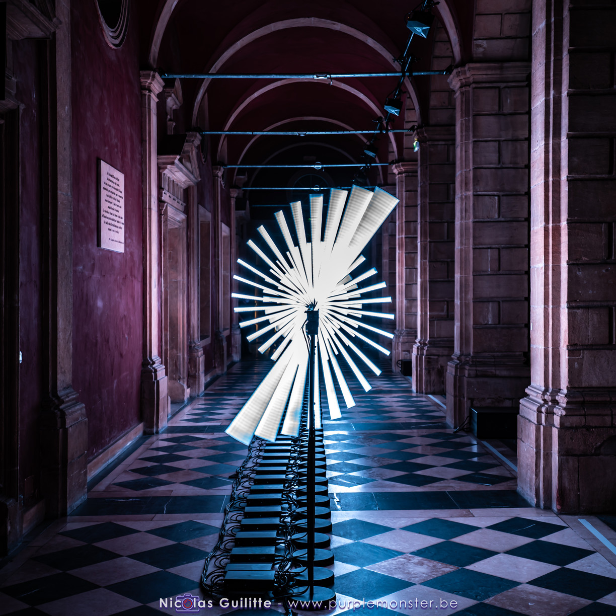 La première installation rencontrée sur mon chemin aura incontestablement été la meilleure selon moi, composée de 2 ensembles de tubes lumineux montés sur des petits mâts, les uns fixes, les autres pivotant autour d'un axe central, et formant des vagues de lumière dans les couloirs d'un cloître. C'était très hypnotique visuellement, avec une ambiance sonore assez envoûtante, je suis resté là une grosse demi-heure, avant de me dire qu'il fallait que je continue si je voulais voir un maximum d'autres installations. Gros coup de coeur en tout cas ! A découvrir en multi-angles dans la vidéo en bas de page.