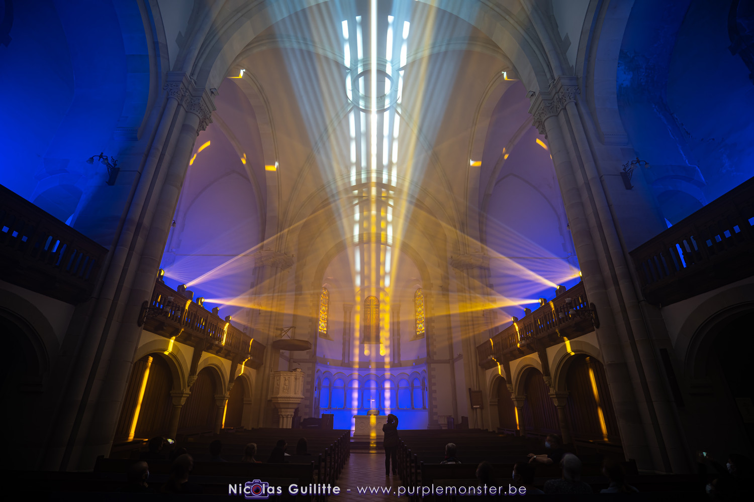 2° coup de cœur de la soirée : un show de faisceaux de lumières à l'intérieur d'une église, débutant avec une séquence complètement aléatoire visuellement, puis enchaînant des motifs parfaitement symétriques.
