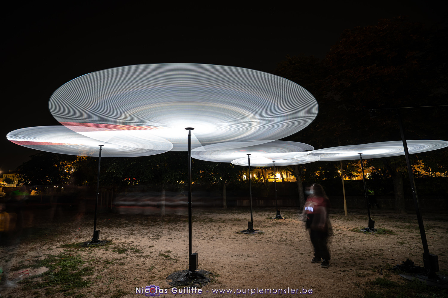 Une installation assez sympa en photo, et qui pour une fois, aurait encore pu l'être davantage s'il y avait eu plus de monde. Elle était composée de plusieurs barres tournoyantes situées sur des mâts, et qui s'illuminaient lorsque des gens passaient en-dessous.