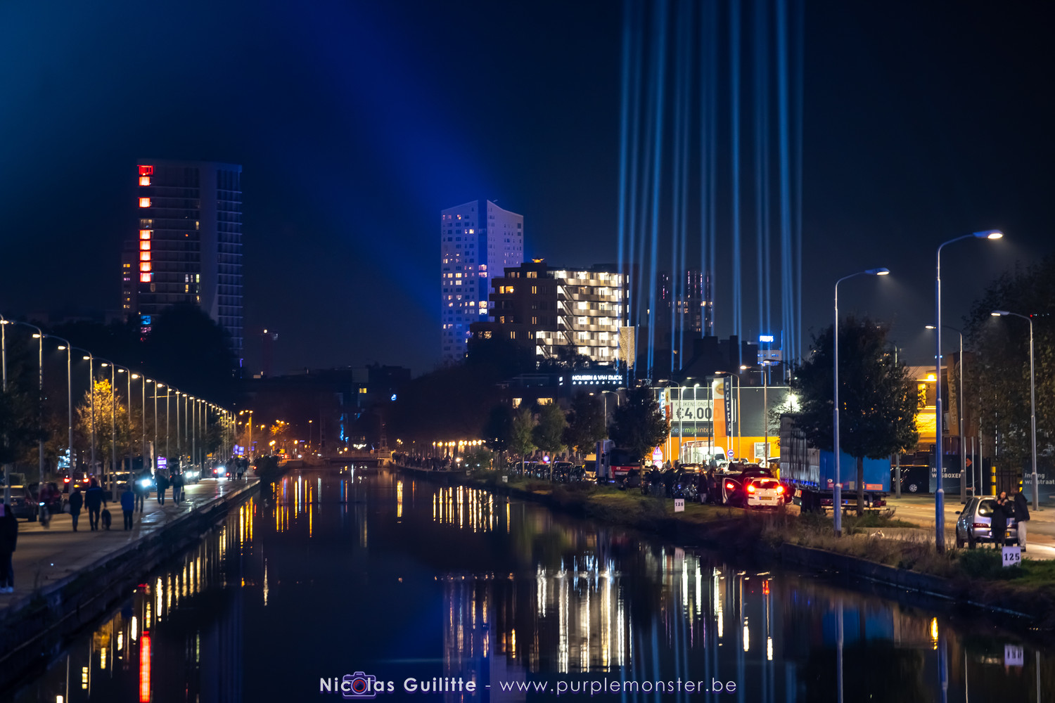 Le début du parcours était en tout cas plutôt attirant, avec un ballet de skytracers sur lequel je reviendrai juste après, ainsi que 2 énormes projecteurs DCA très puissants, datant de la 2° guerre mondiale et remis à neuf, convergeant vers une sorte de diamant géant suspendu à une grue au-dessus du canal.