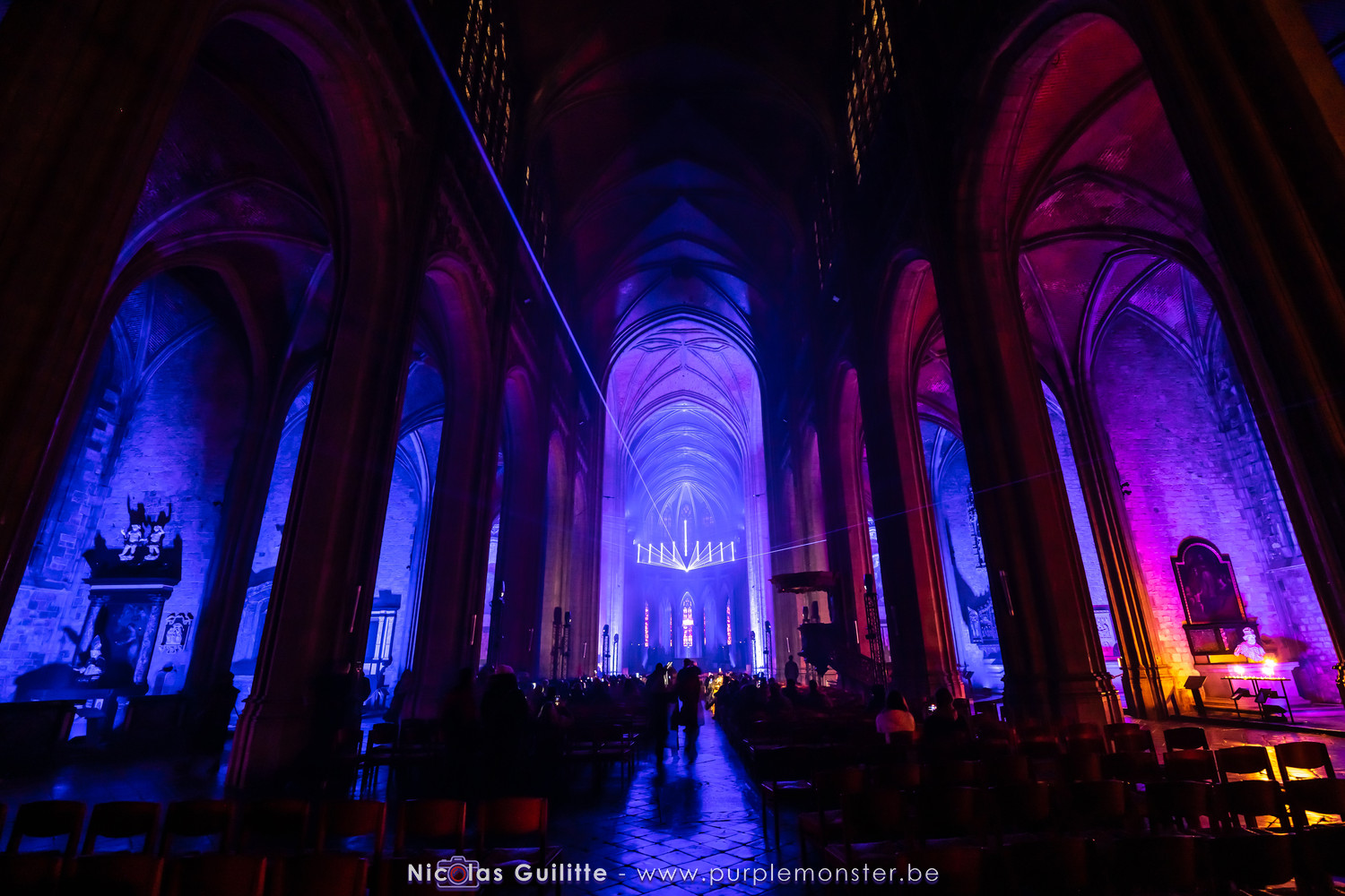 Dans l'optique d'éviter la foule du début de soirée, même si peu nombreuse, je démarre le parcours par la fin. Première installation et premier coup de cœur, avec un son et lumières à l'intérieur d'une grande collégiale, illuminée au moyen de lasers et autres faisceaux de lumières. Ce genre d'endroit se prête toujours très bien à de telles mises en lumières. Assurément la meilleure installation du festival selon moi !