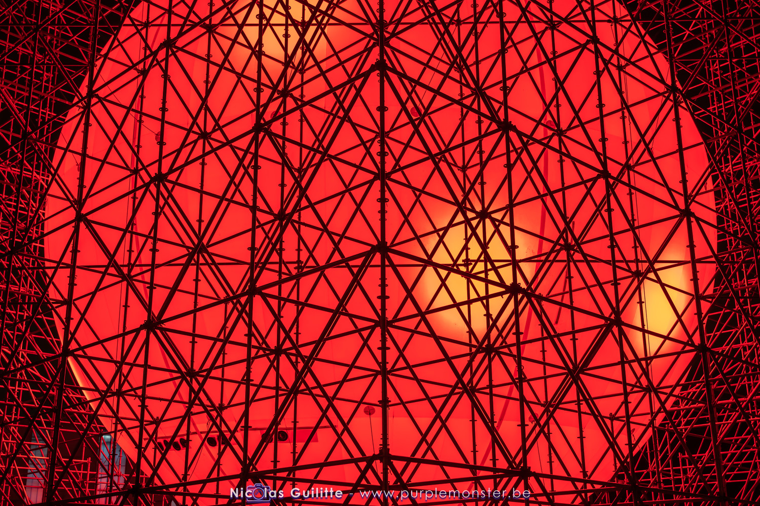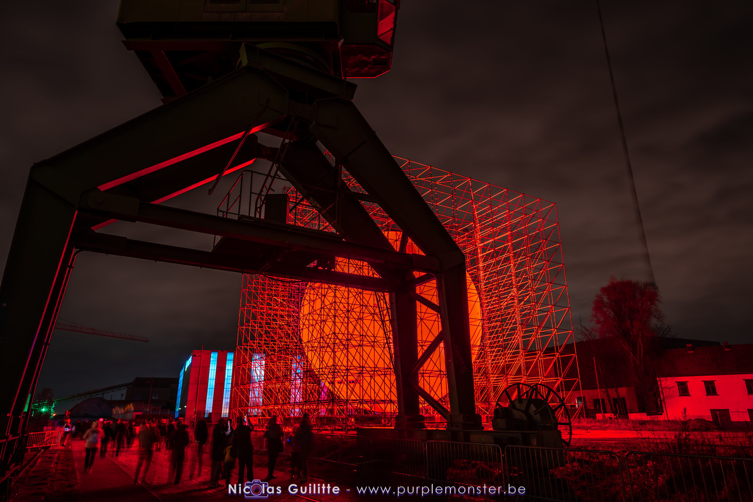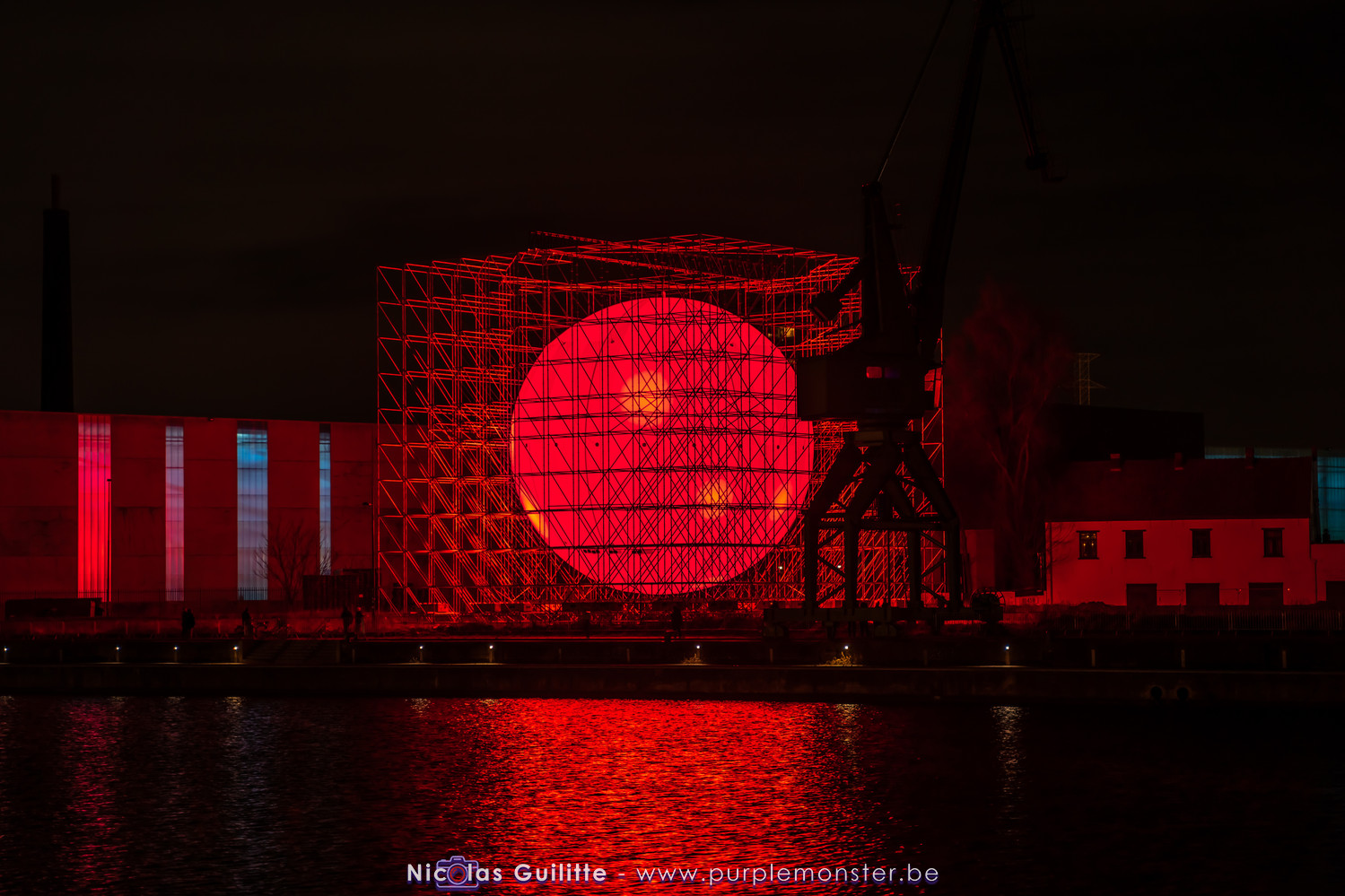 On démarre avec une des installations les plus impressionnantes du festival et pour le moins insolite, à savoir une gigantesque sphère lumineuse rouge de plus de 20m de haut, enfermée dans un énorme échafaudage. Un peu plus loin, plusieurs grues des anciens docks sont également mises en valeur au moyen d'éclairages led et de video-mapping, re-dessinant les contours de ces structures assez imposantes.