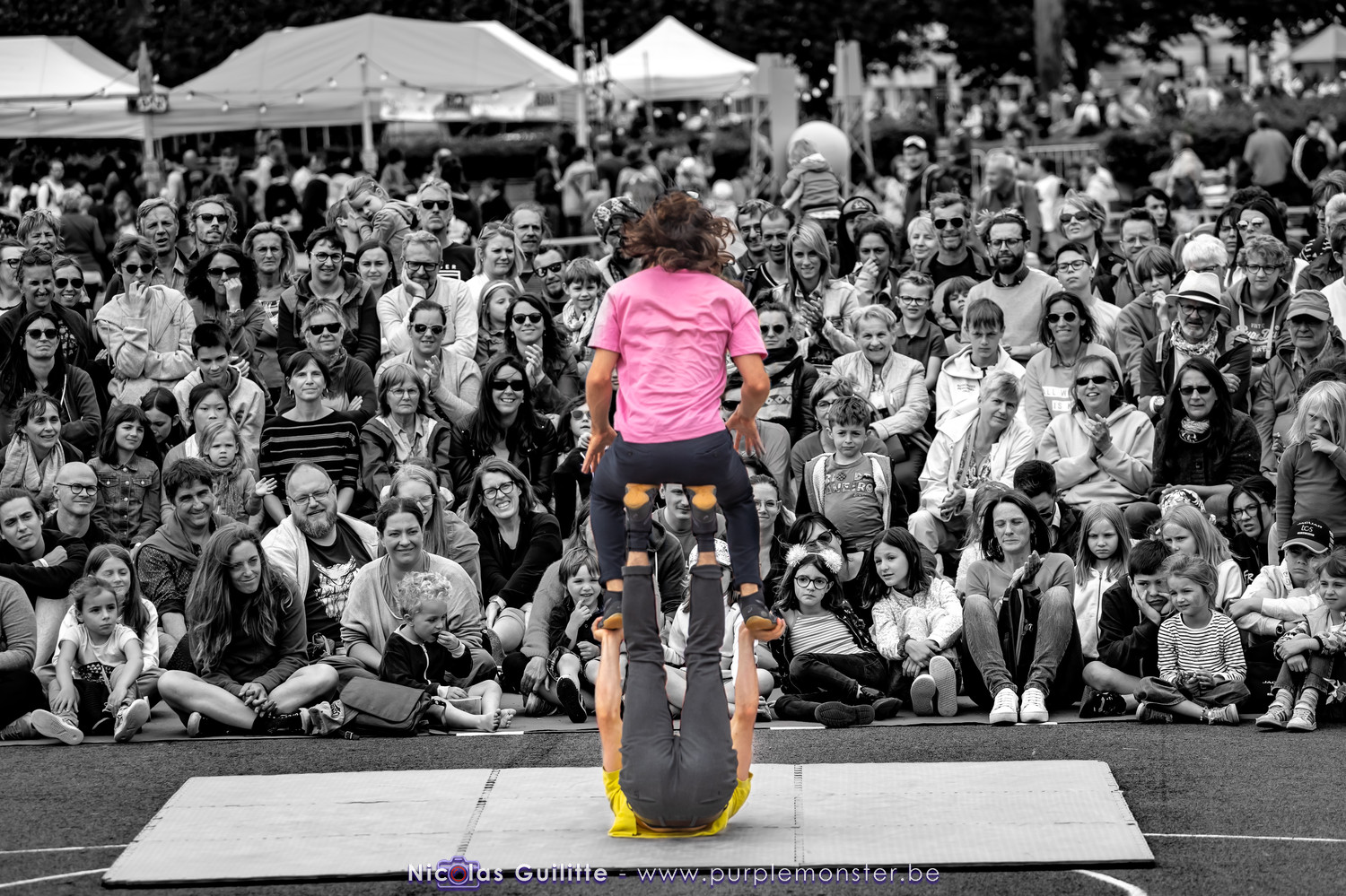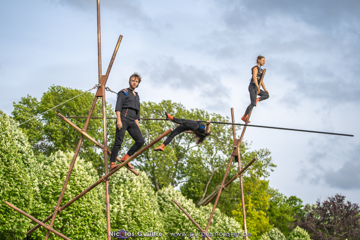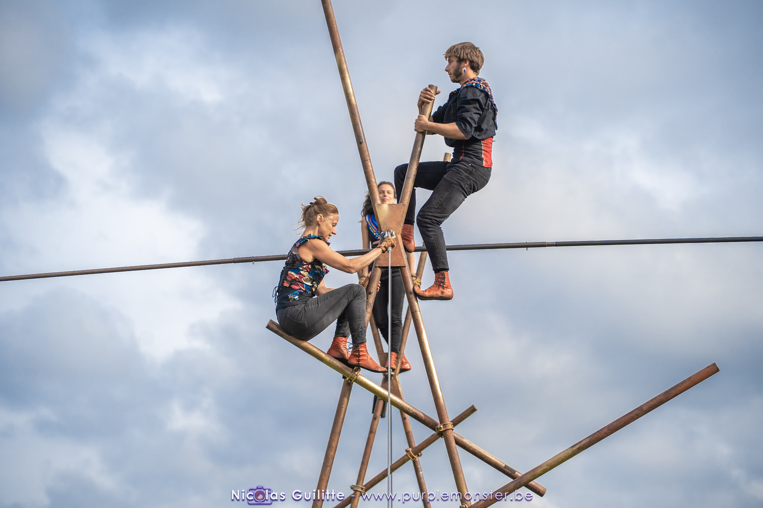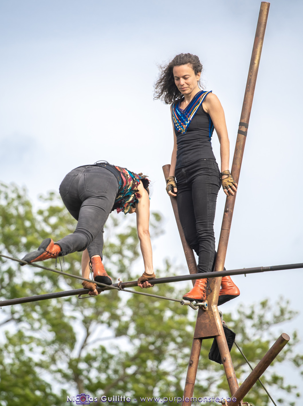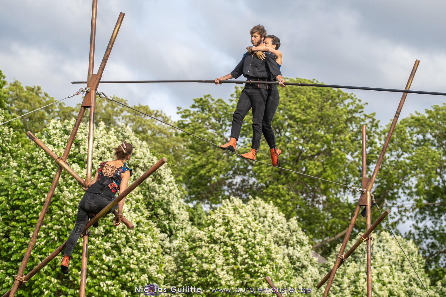 Changement d'ambiance avec un spectacle de funambules de la Cie des Chaussons Rouges, évoluant avec aisance sur un câble à plusieurs mètres du sol.