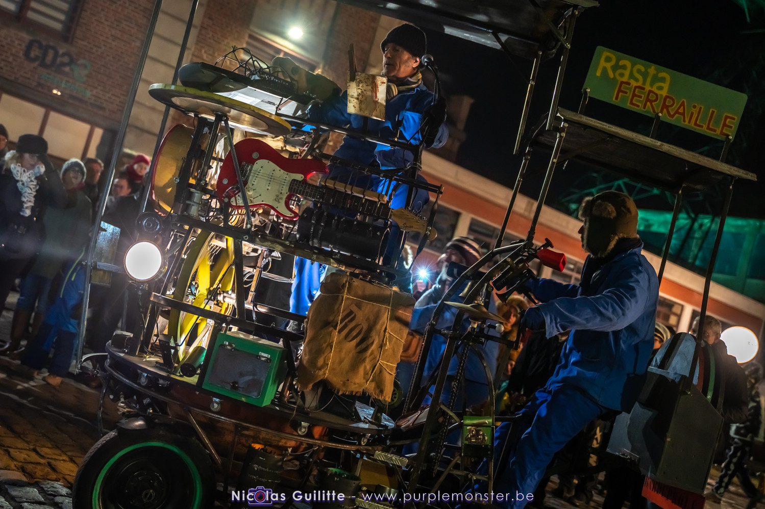 En prélude aux installations et spectacles de feu de cette 2° soirée du festival de la Sainte-Barbe, quelques photos de la Cie Dynamogène, et leur "RastaFerraille", sorte d'hybride entre un vélo et une machine-orchestre composée de plusieurs instruments, actionnés mécaniquement au moyens de leviers et autres pédales. Très original !