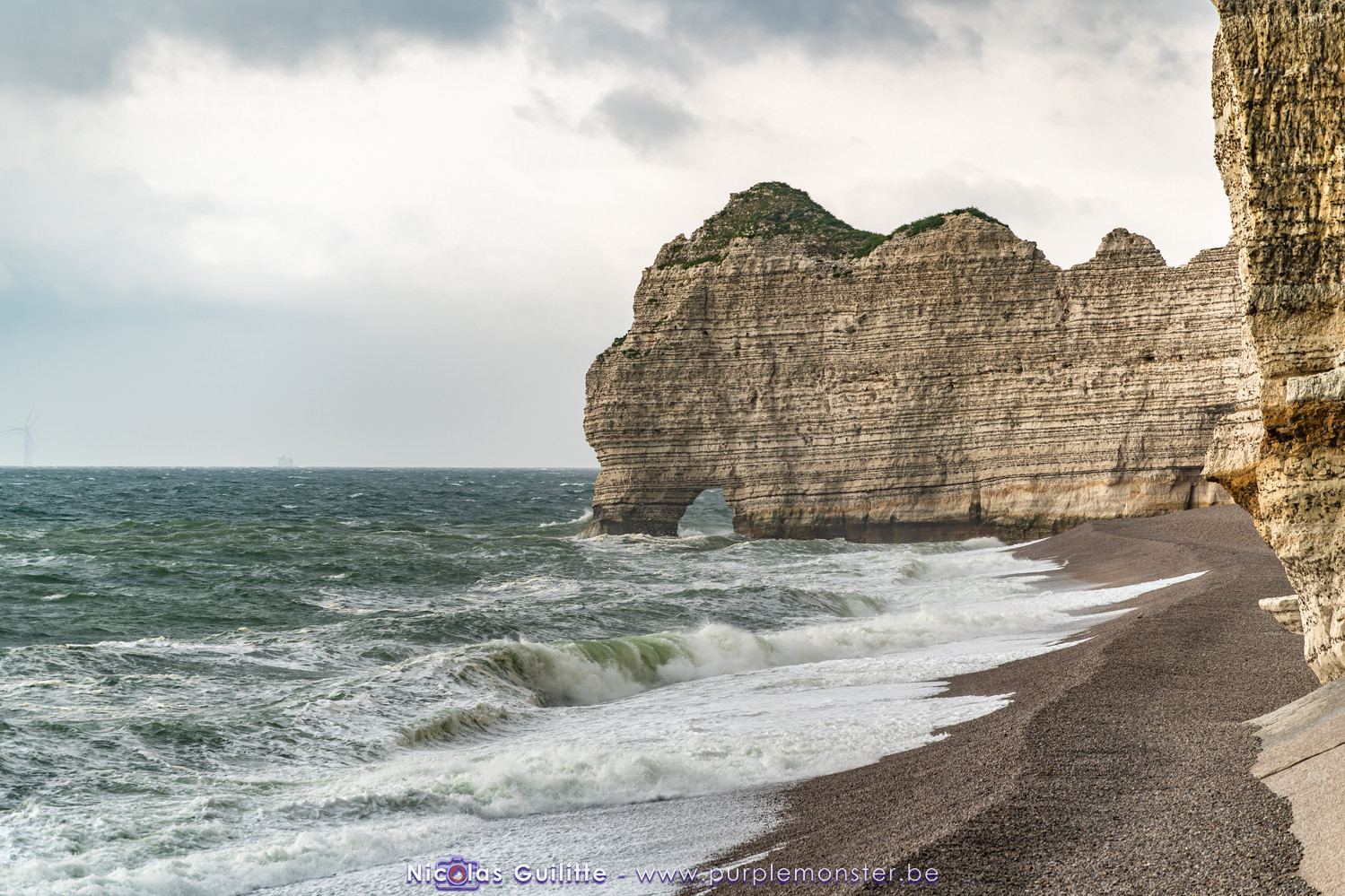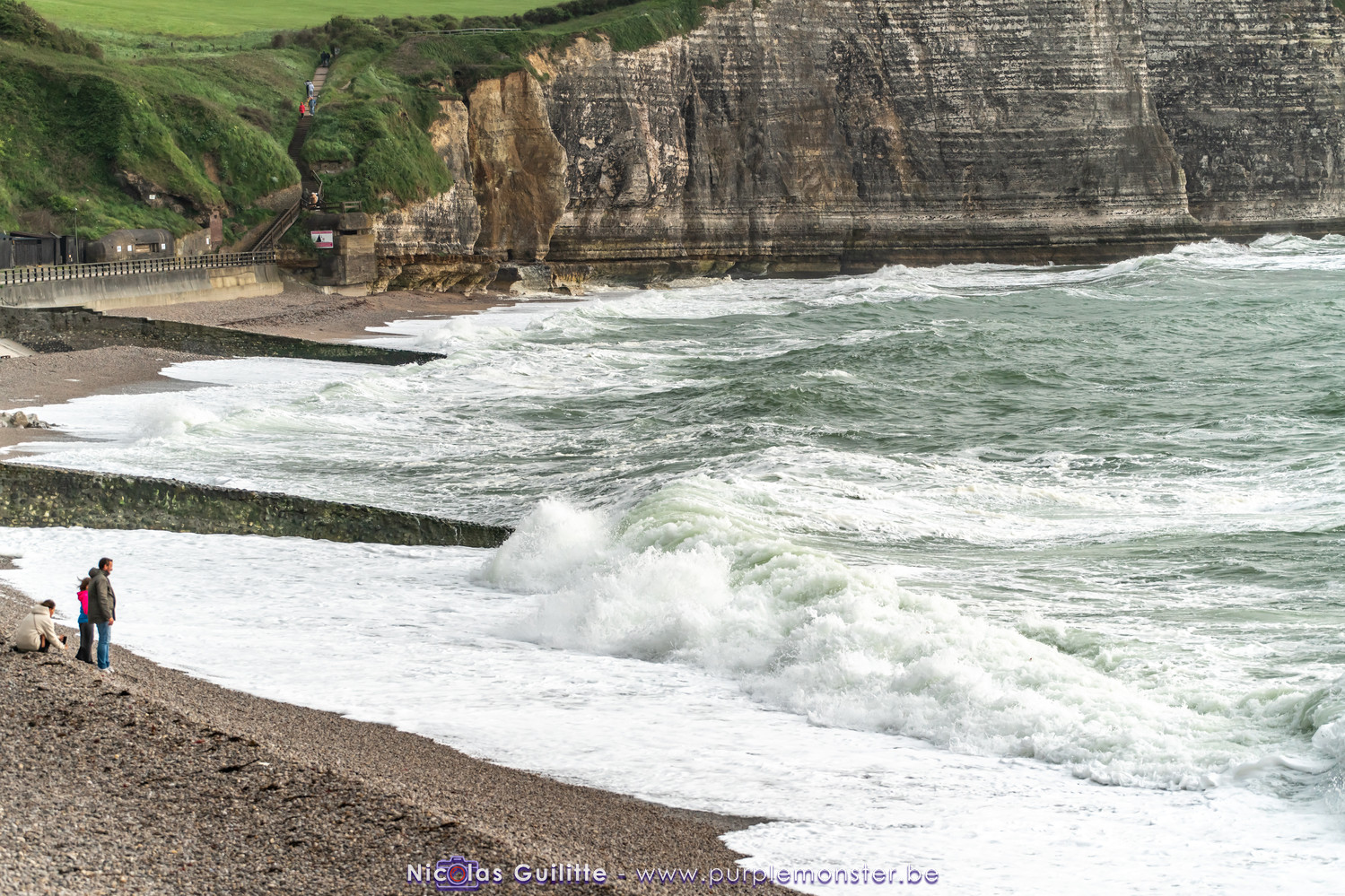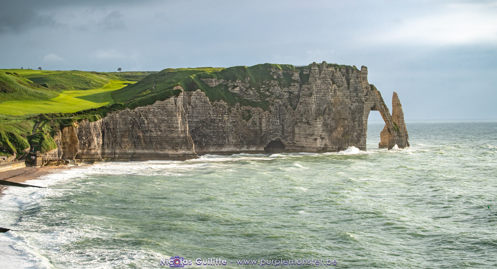 Première étape d’un week-end prolongé du côté de la Normandie et de la Bretagne, à Etretat, histoire d’aller voir au moins une fois les fameuses falaises. Pour les photos "carte postale" avec un beau coucher de soleil, ce sera pour une autre fois ! L’ambiance était plutôt aux pluies diluviennes, à tel point que j’ai hésité à rester bien à l’abris dans ma chambre d’hôtel quelques kilomètres plus loin. La météo indiquait cependant une accalmie à partir de 20h, et pour une fois elle ne s’était pas trompée puisque les trombes d’eau se sont effectivement arrêtées net à 20h pile, juste au moment où je me garais sur le parking ! Timing plus que parfait !