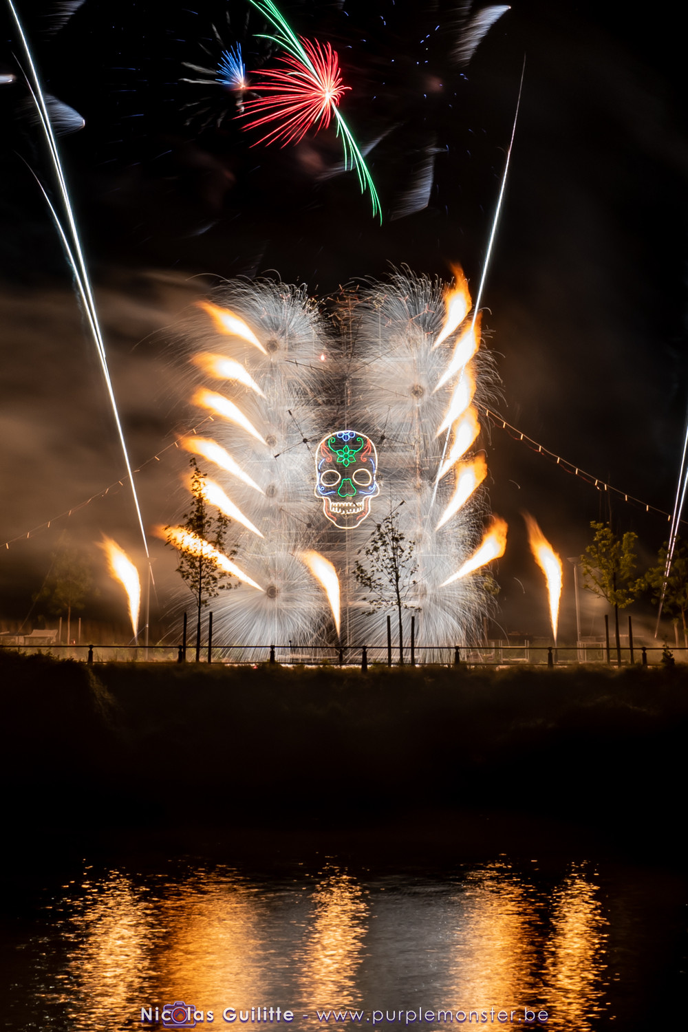 Point d'orgue de cette soirée d'ouverture, à l'issue d'une grande parade à travers la ville, un spectacle pyrotechnique du Groupe F, sur le thème du Mexique, en lien direct avec le thème du festival. Et pour l'occasion, le show était conçu autour d'un "castillo", une grande structure de 15m de haut sur laquelle étaient accrochés une multitude de jets et autres structures tournoyantes. C'était vraiment le point fort du spectacle, car à part au Grand Feu de Saint-Cloud ces 10 dernières années, c'est vraiment le style d'effets qu'on n'a pas trop l'habitude de voir dans nos contrées, et encore moins dans une telle quantité. Et si l'on excepte l'une ou l'autre petites asymétries, c'était franchement réussi !