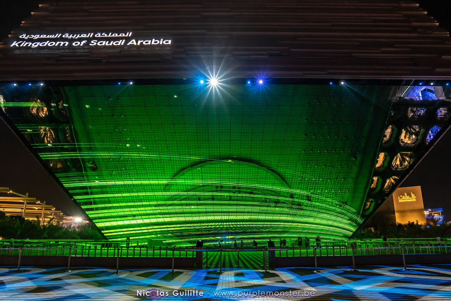 Pavillon de l'Arabie Saoudite, sans doute l'un des plus imposants et des plus originaux d'un point de vue architectural. Et l'intérieur valait le coup aussi, on peut dire qu'ils ont mis les petits plats dans les grands. Pas trop de messages éducatifs ni de slogans voulant nous donner bonne conscience ici, on était plus sur l'aspect "vitrine" du pays, avec des décors et des animations visuelles dignes d'un parc d'attractions. La visite commençait par un long escalator autour duquel étaient érigés des décors mettant en valeur le patrimoine architectural. C'était ensuite les nombreux paysages du pays qui étaient présentés, au moyen d'un écran incurvé à 180°, et d'un autre placé sous une passerelle, assurant le "prolongement" du premier. L'effet était très sympa, on avait vraiment l'impression de voler. Et au-delà de ça, j'ai l'impression qu'il doit y avoir pleins de paysages à couper le souffle dans ce pays.