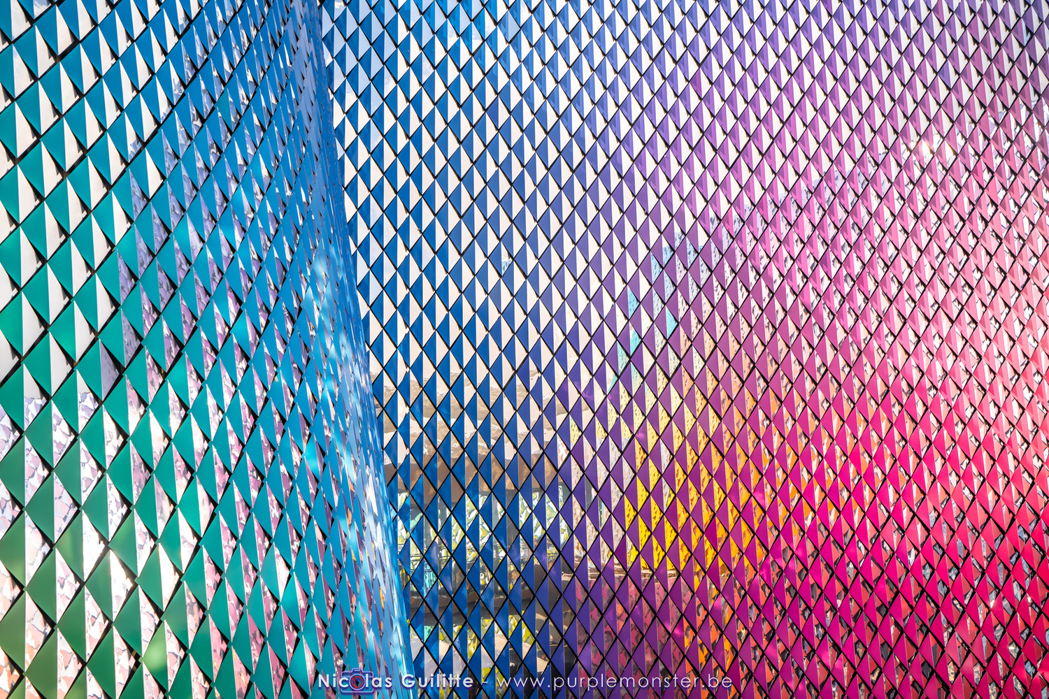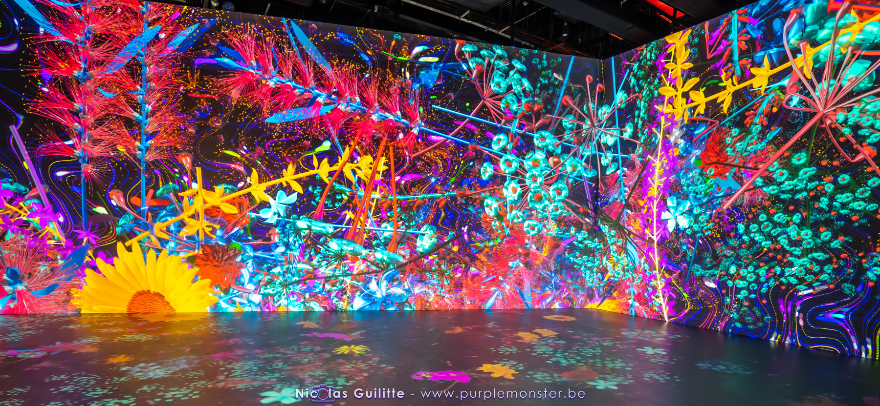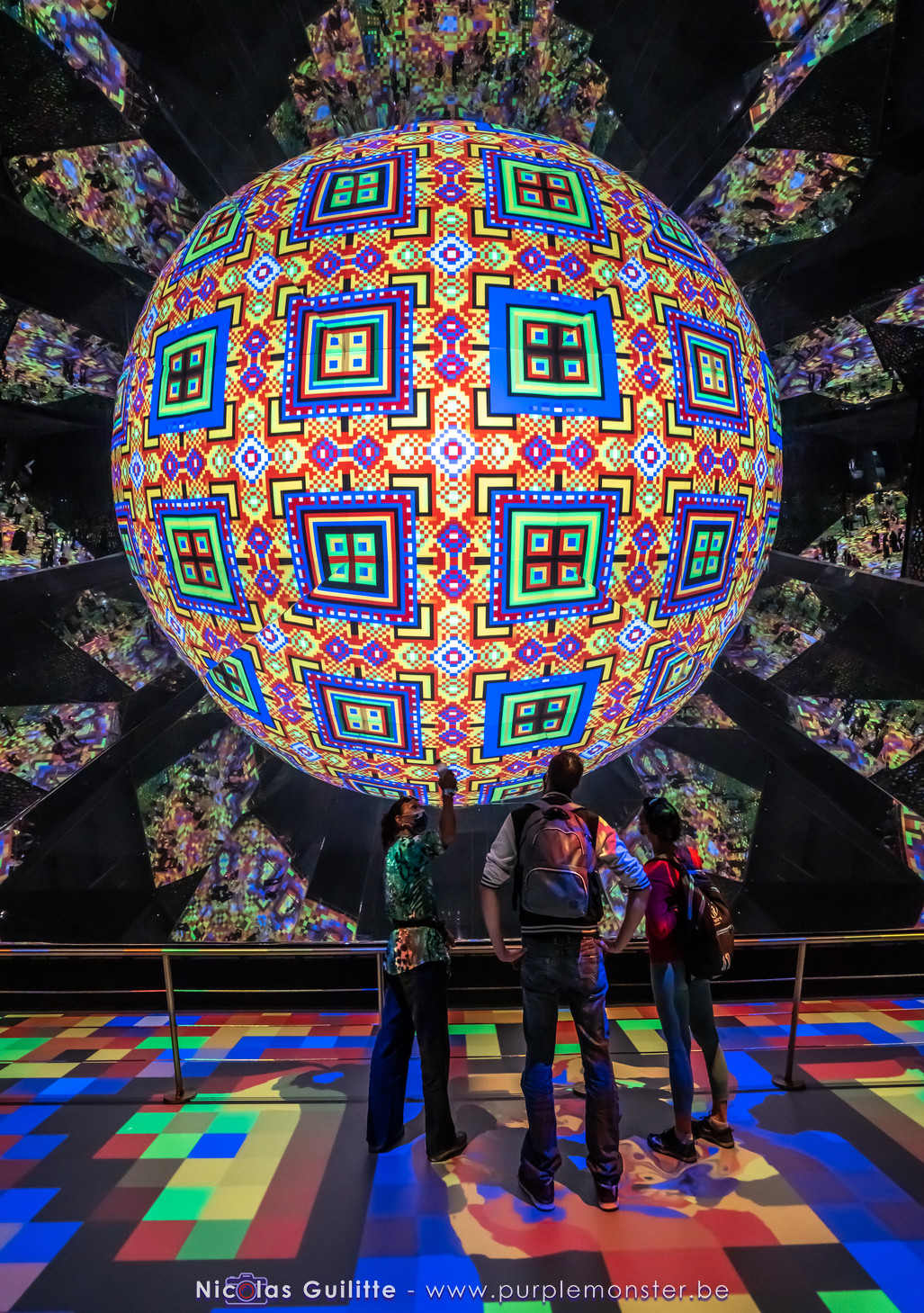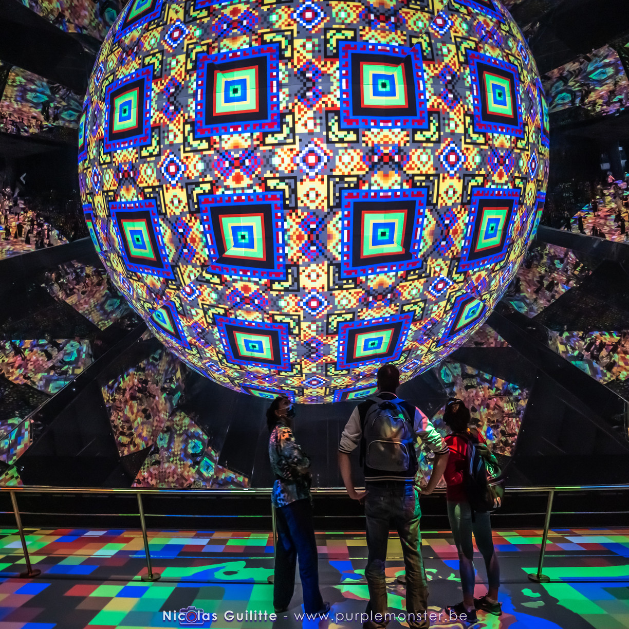 La troisième curiosité du pavillon était un gigantesque kaleidoscope représentant une sphère aux aspects phychédéliques. En y regardant de plus près, il n'y avait en fait qu'un seul écran au milieu, l'effet de sphère étant rendu par tout un jeu de miroirs. Très impressionnant visuellement en tout cas !