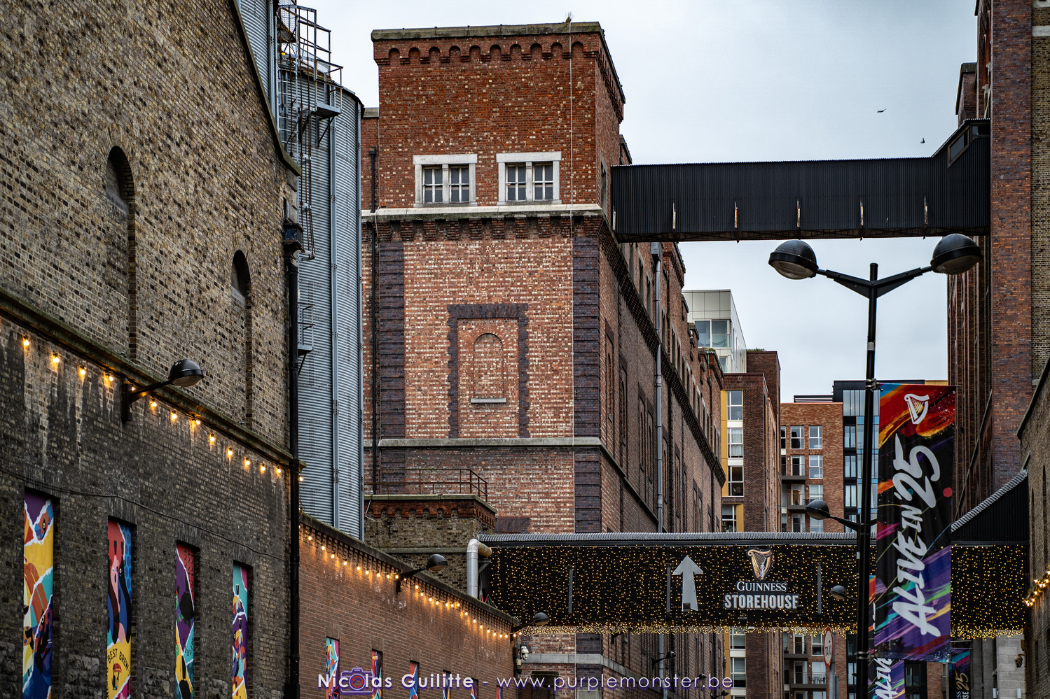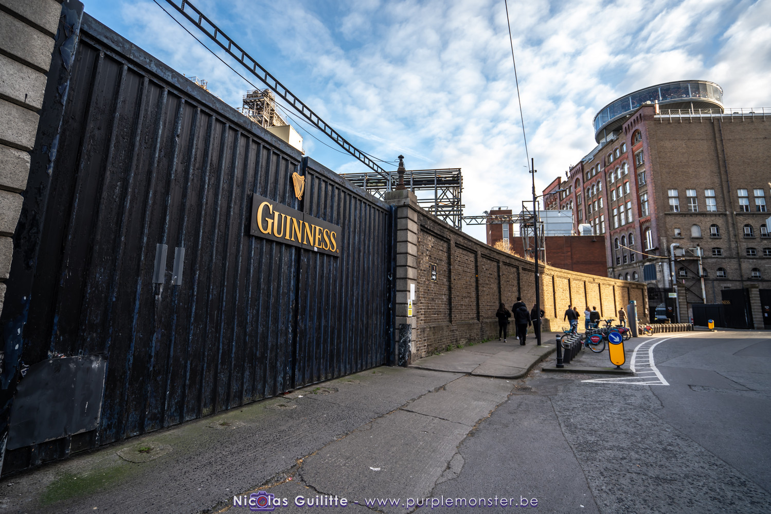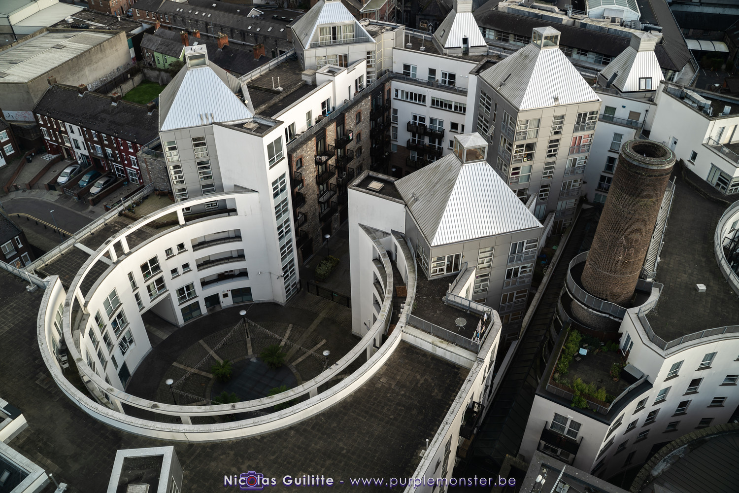 Au loin l'immense site de la brasserie Guinness, avec le double bar panoramique au sommet de l'ancien bâtiment.