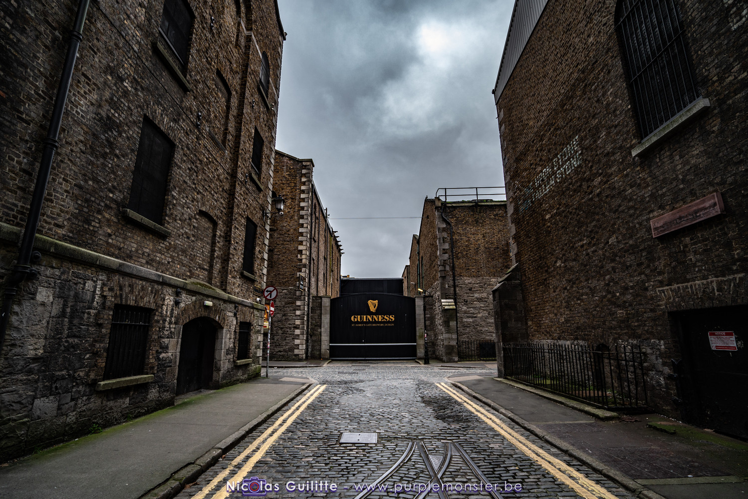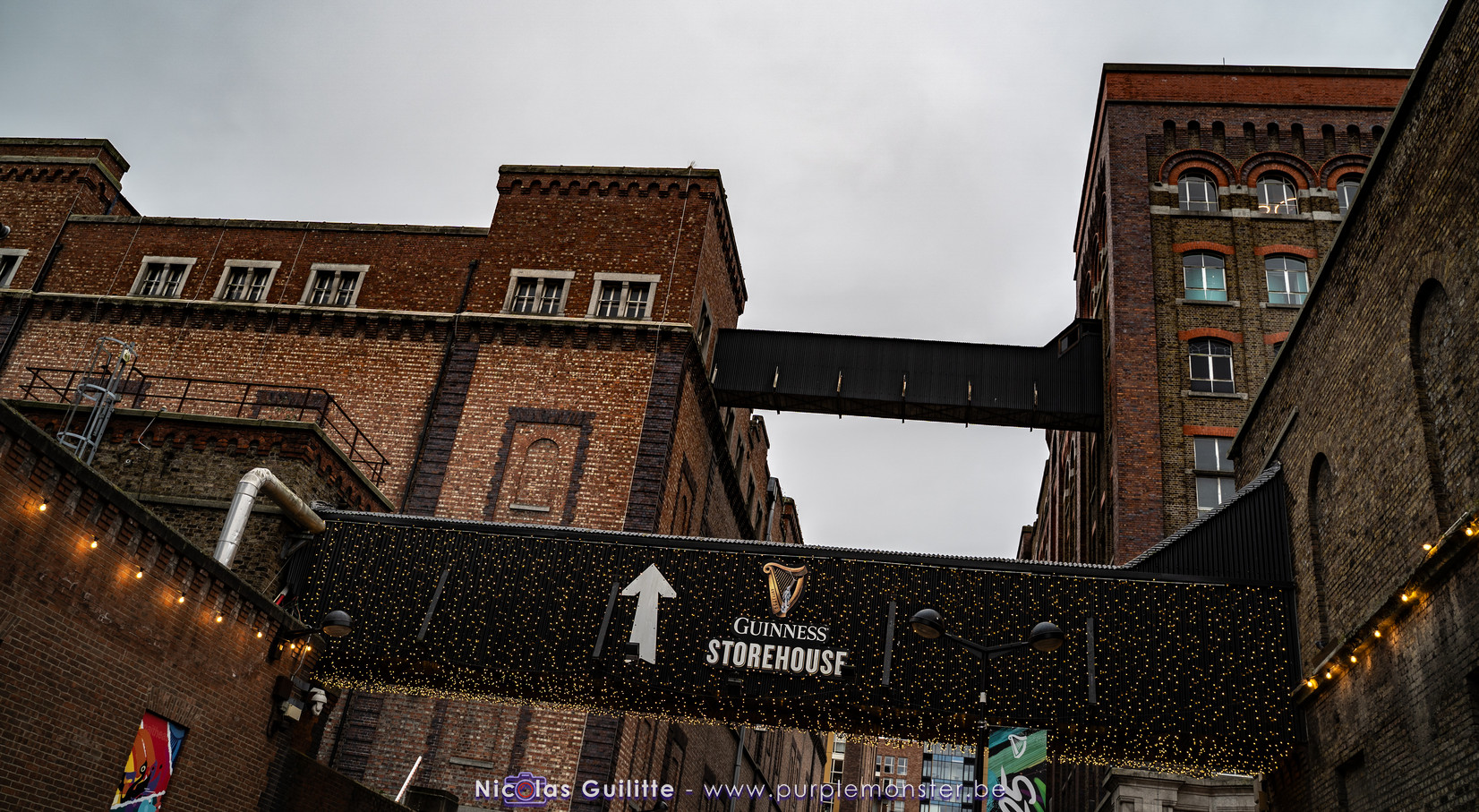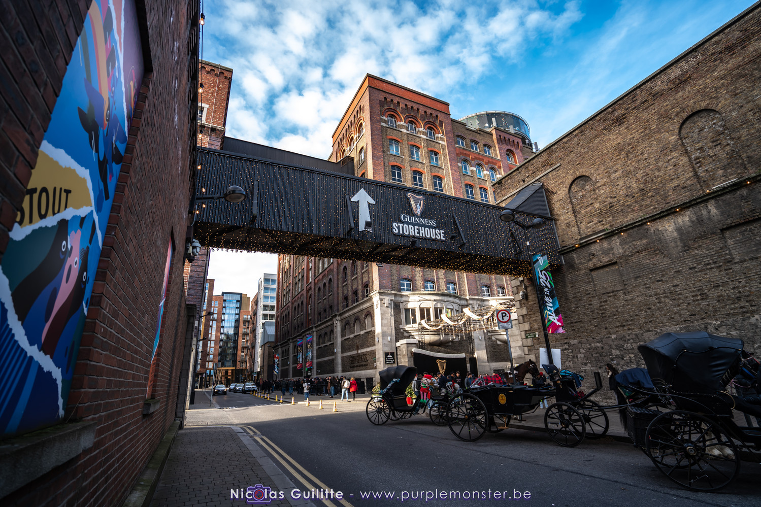 Au loin l'immense site de la brasserie Guinness, avec le double bar panoramique au sommet de l'ancien bâtiment.