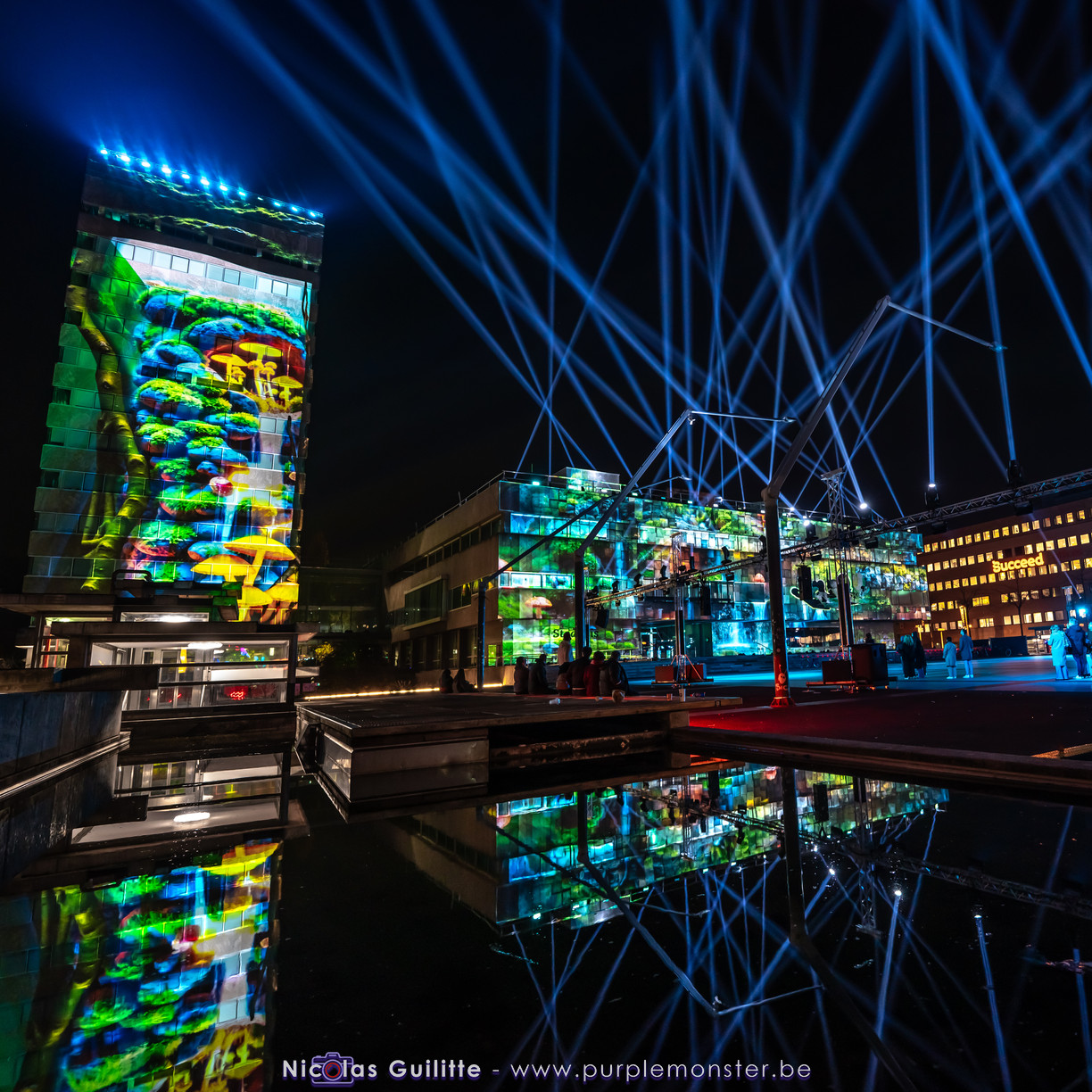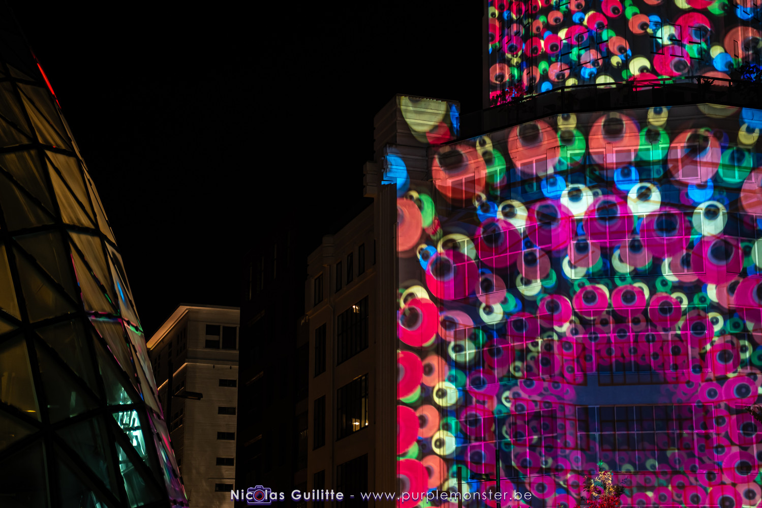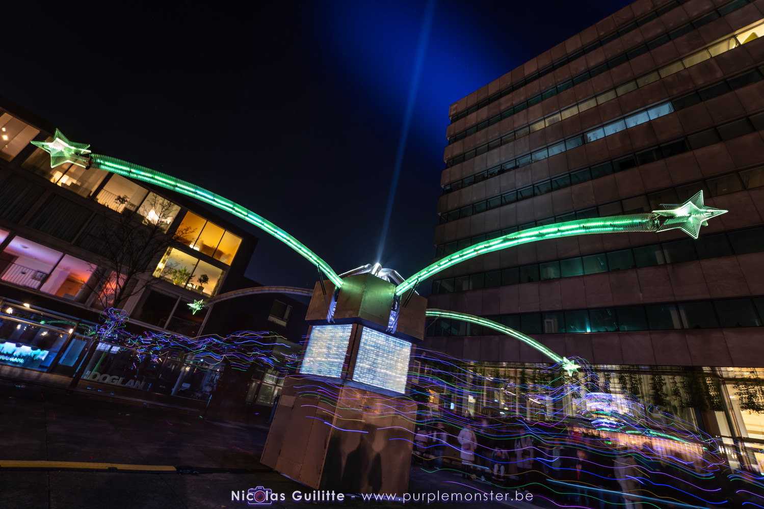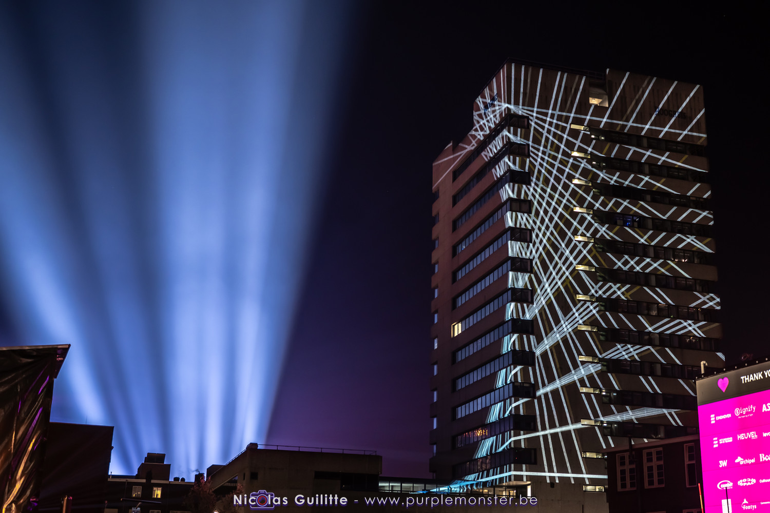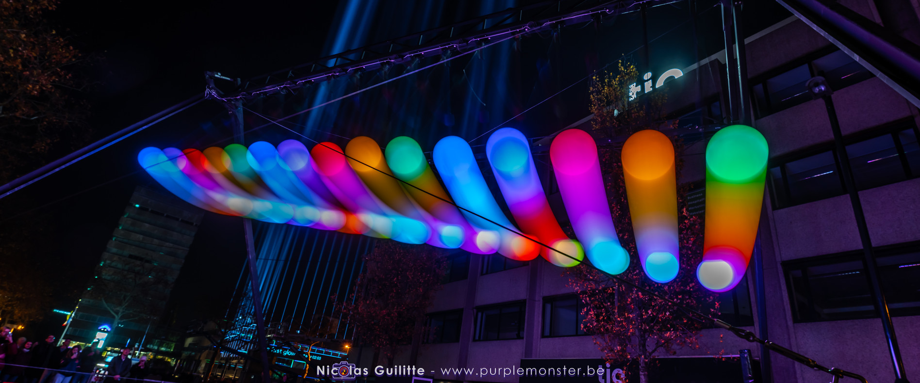 L'installation sans doute la plus impressionnante du festival, mêlant video-mapping et jeux de lumières. Le mapping en lui-même n'était pas spécialement original, d'autant plus que les 2 buildings servant de support étaient très basiques. En revanche le ballet de skytracers qui accompagnait le show était particulièrement réussi, visible depuis à peu près partout dans la ville.