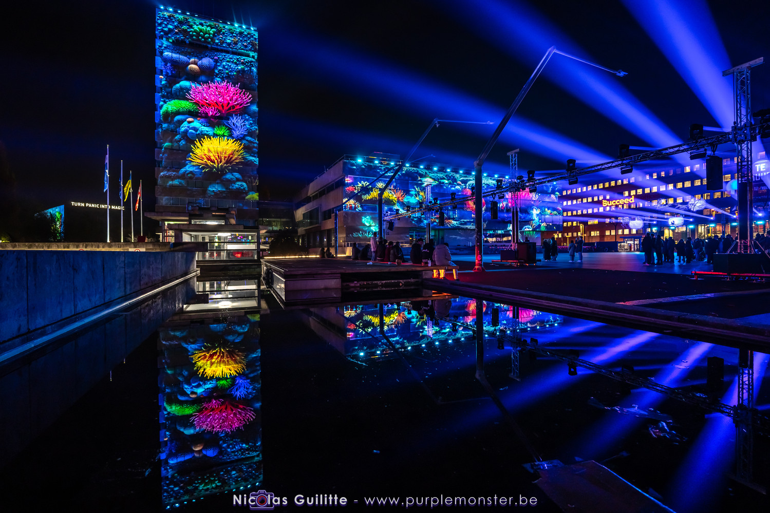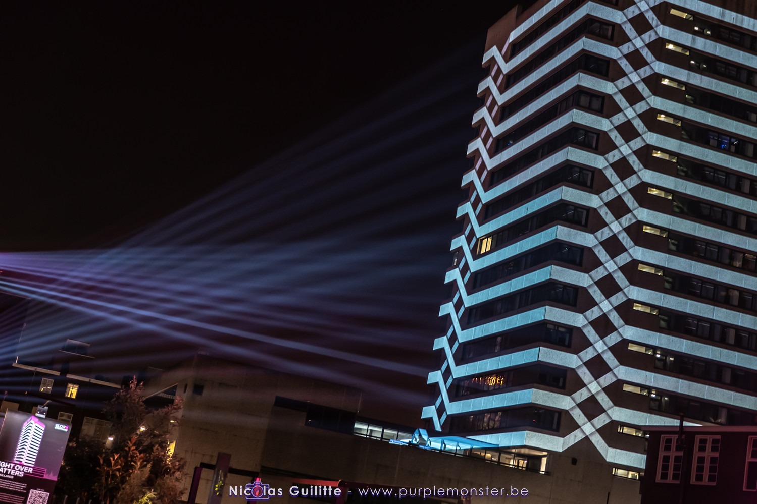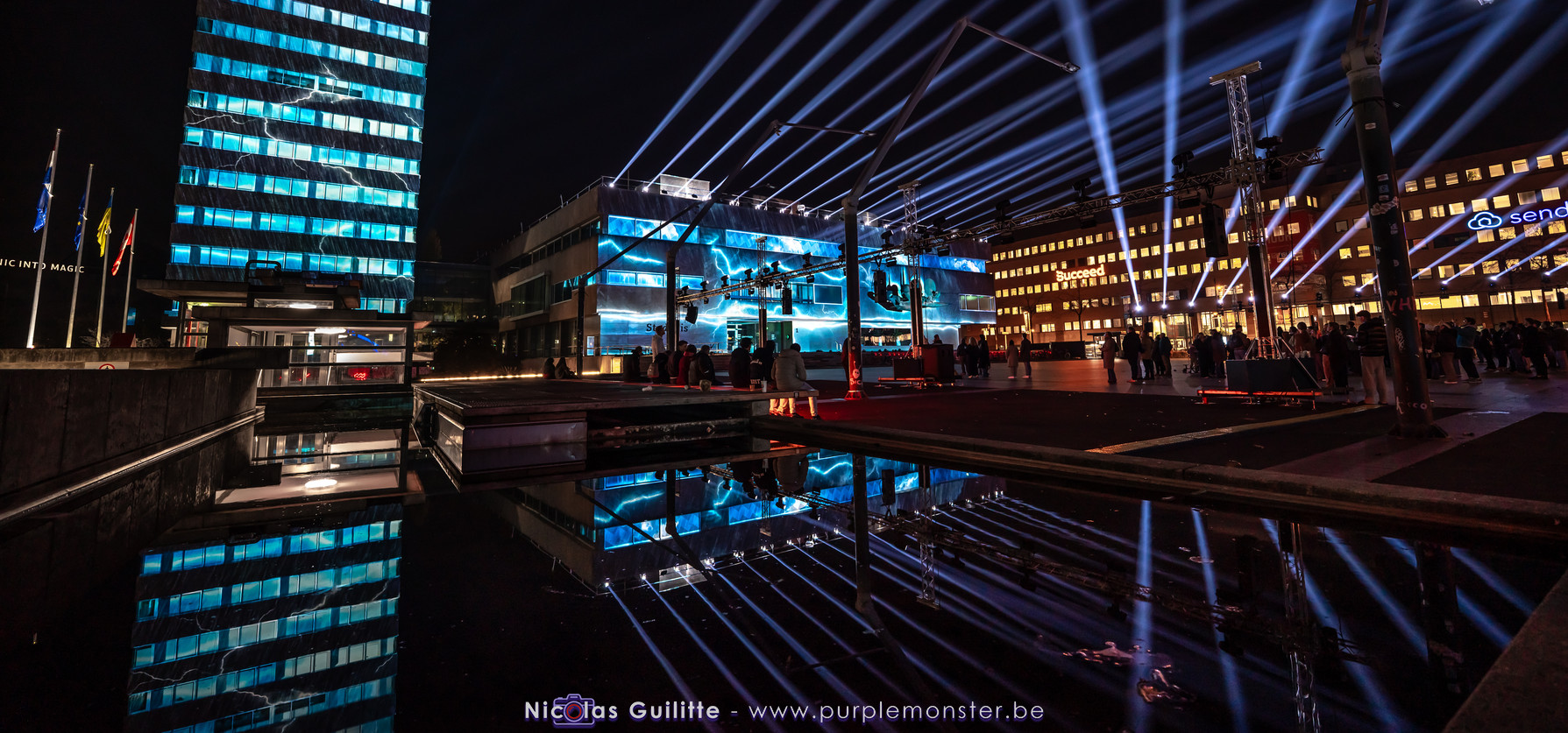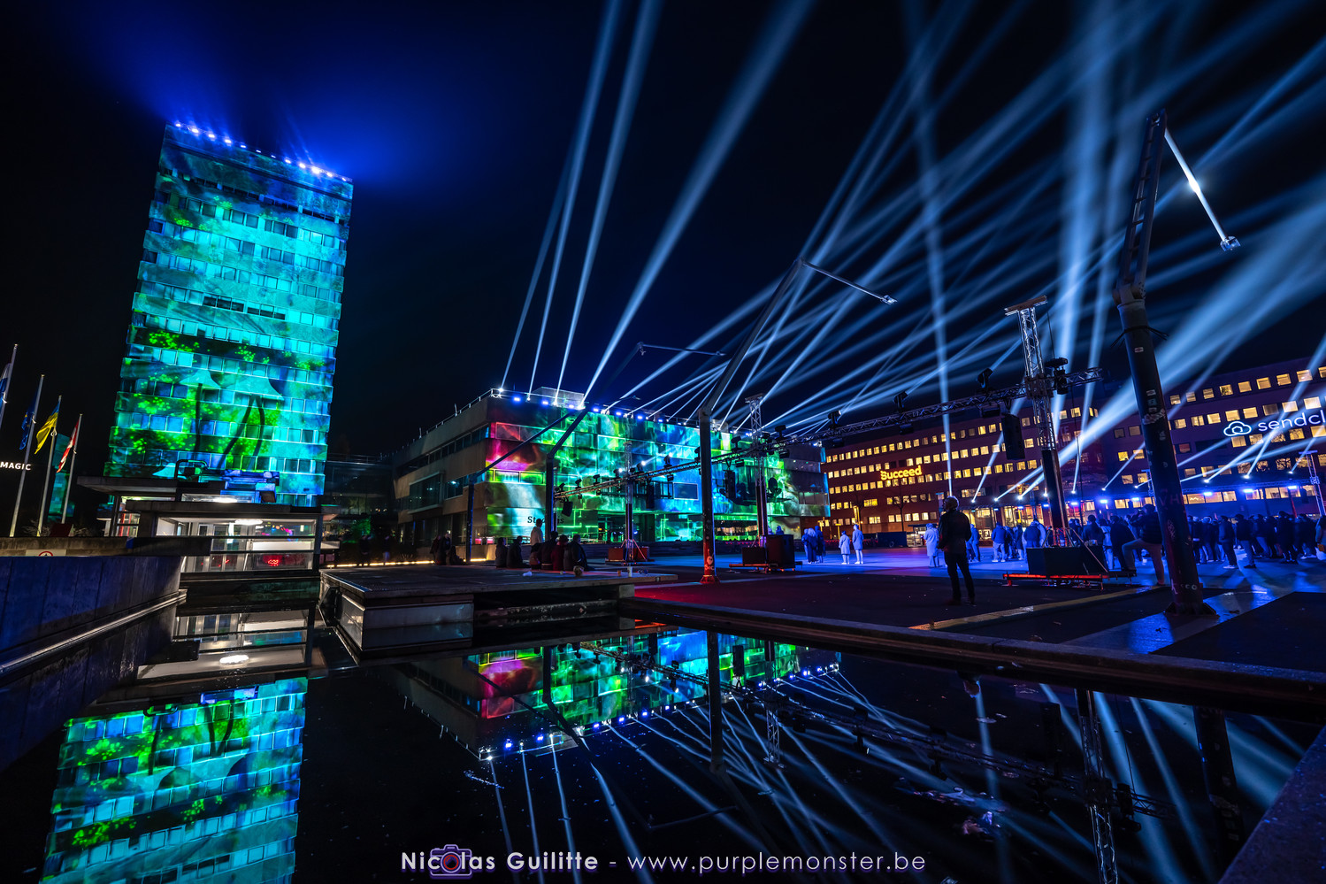 L'installation sans doute la plus impressionnante du festival, mêlant video-mapping et jeux de lumières. Le mapping en lui-même n'était pas spécialement original, d'autant plus que les 2 buildings servant de support étaient très basiques. En revanche le ballet de skytracers qui accompagnait le show était particulièrement réussi, visible depuis à peu près partout dans la ville.