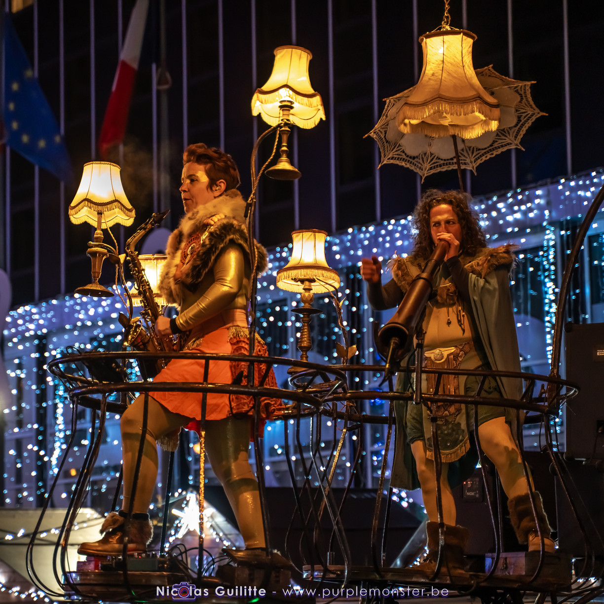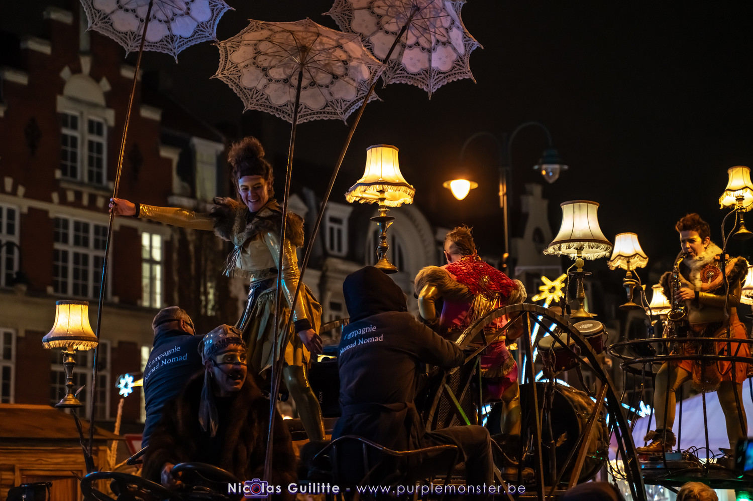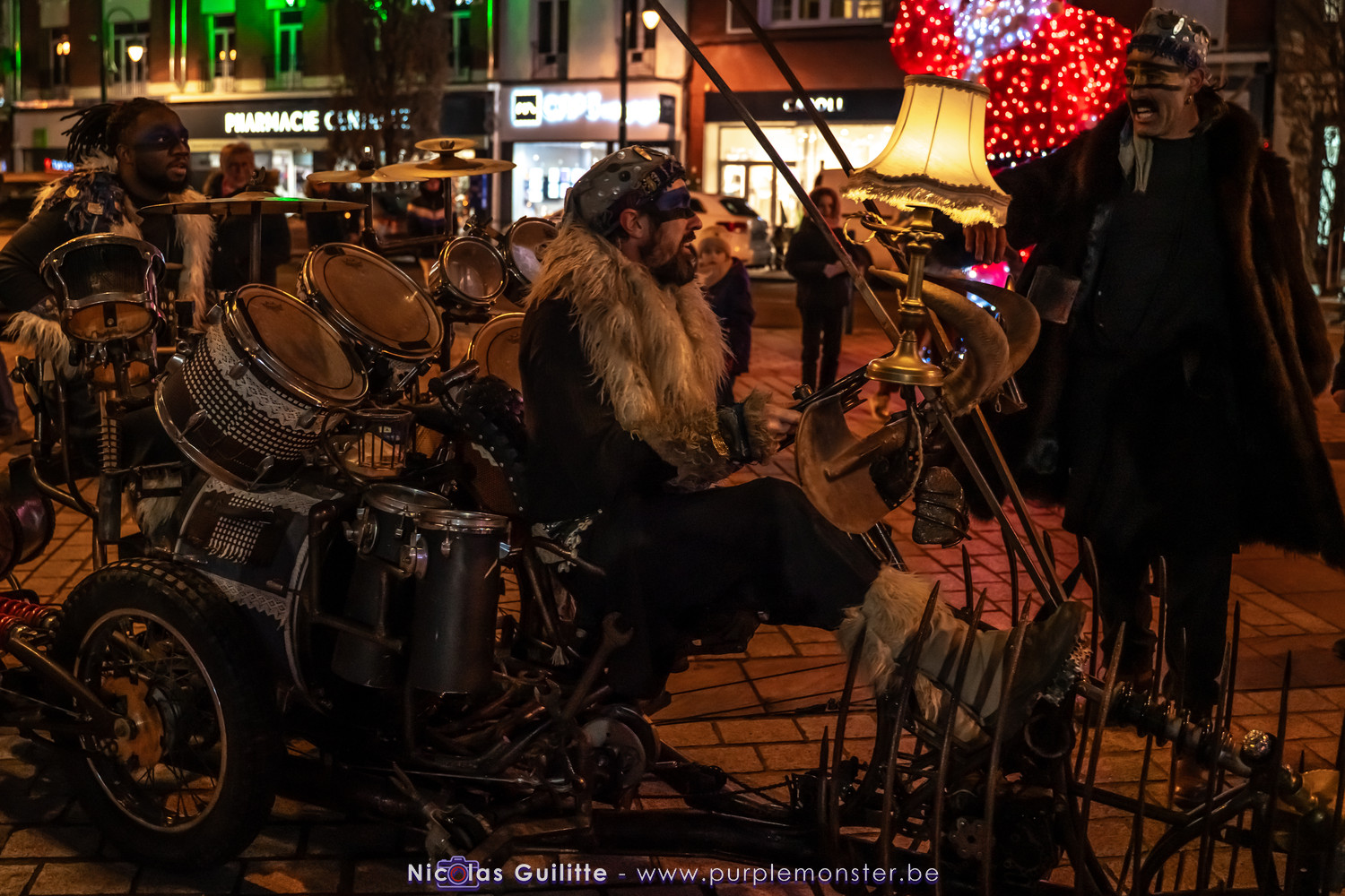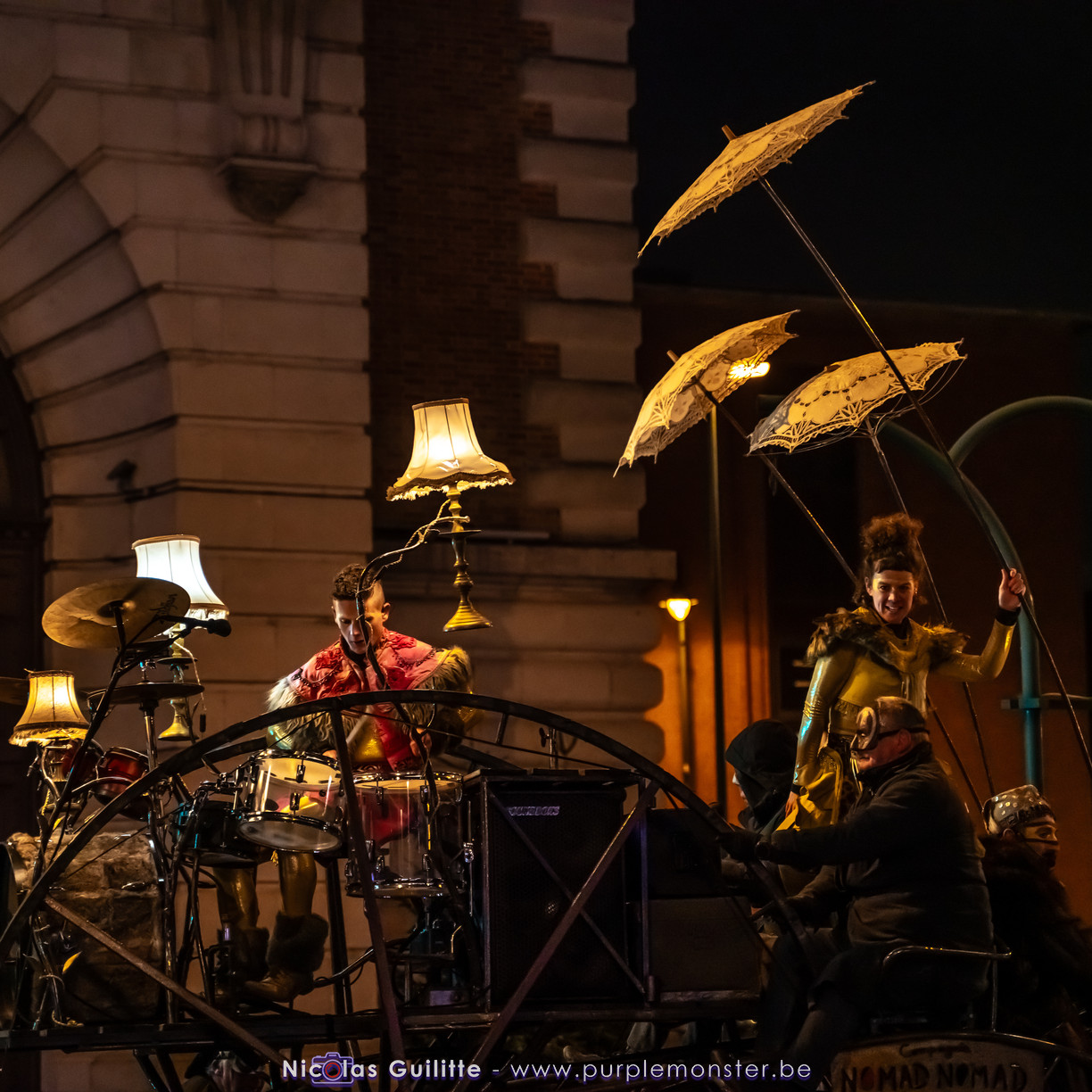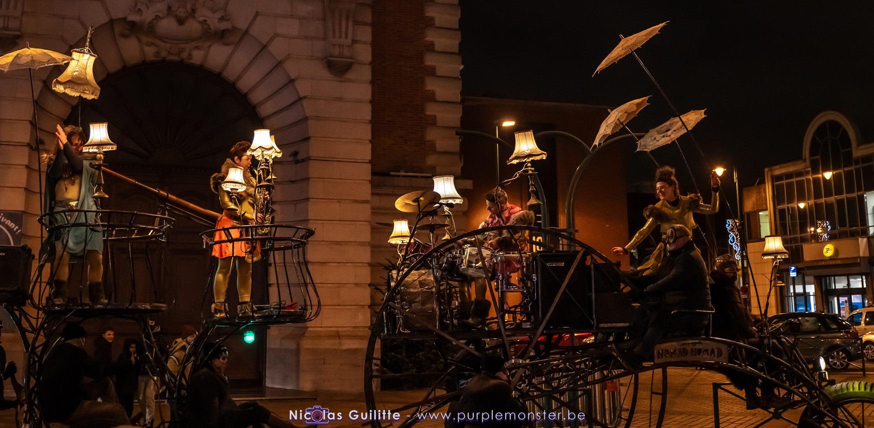 Lancement des festivités du week-end, dans le cadre du festival de la Sainte-Barbe, avec pour commencer une déambulation de la Cie Nomad Nomad dans le centre-ville de Lens, à bord de l'Ethno-Machine, un engin mobile en métal qui pourrait être sorti d'un univers de Mad Max, avec une petite touche baroque en plus, le tout dans une ambiance musicale assez envoûtante et entraînante à la fois, très sympa !