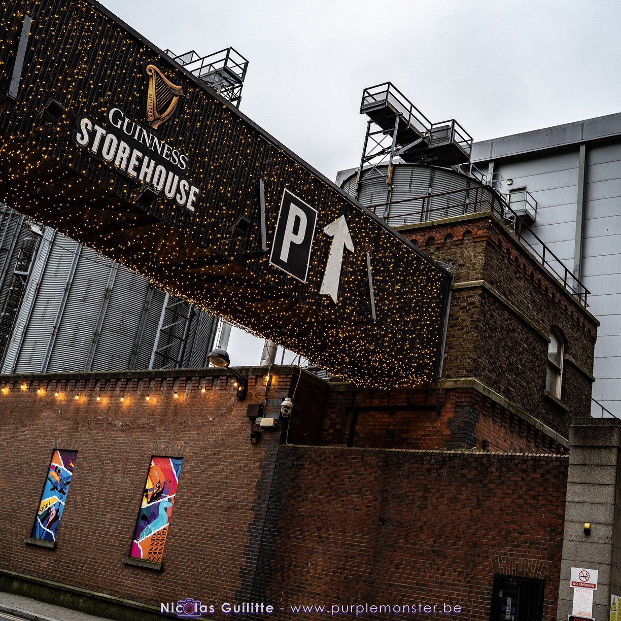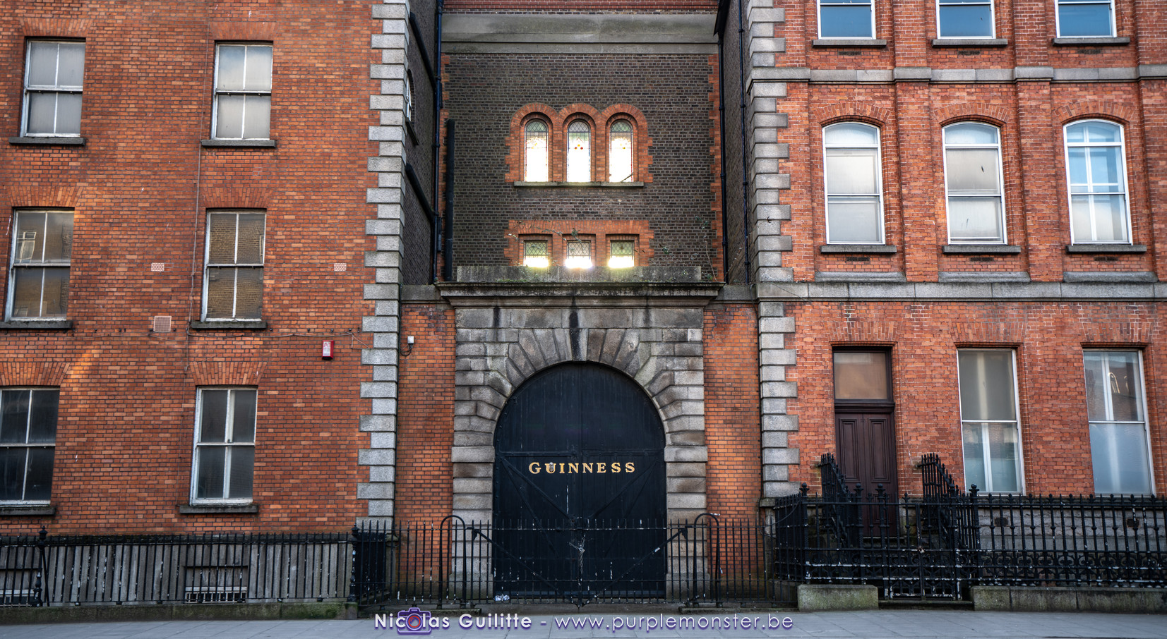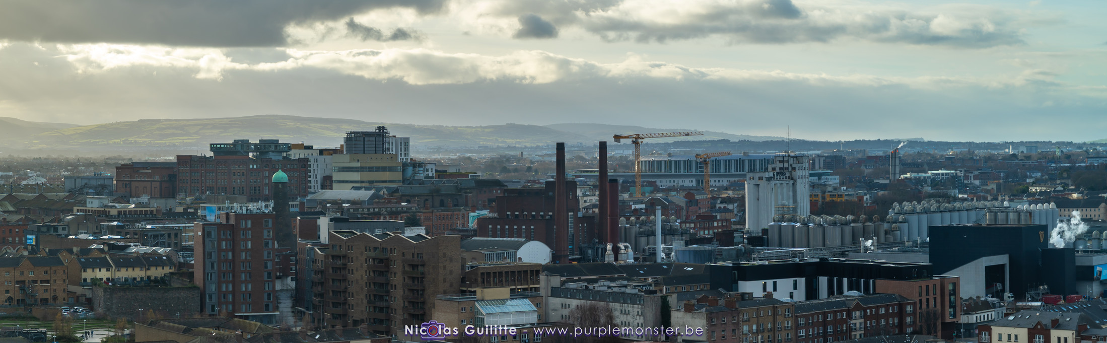Au loin l'immense site de la brasserie Guinness, avec le double bar panoramique au sommet de l'ancien bâtiment.