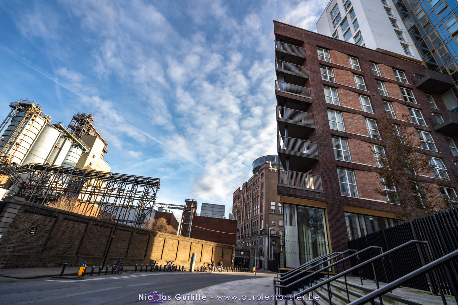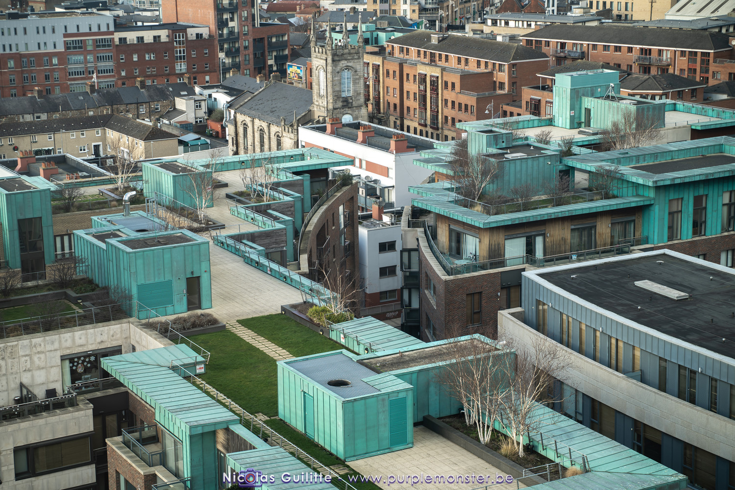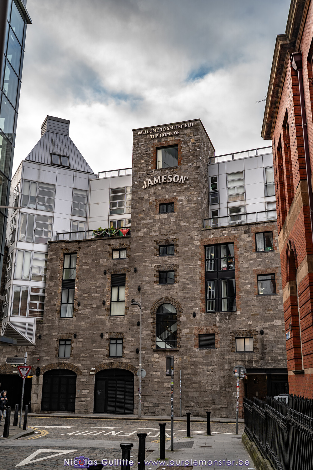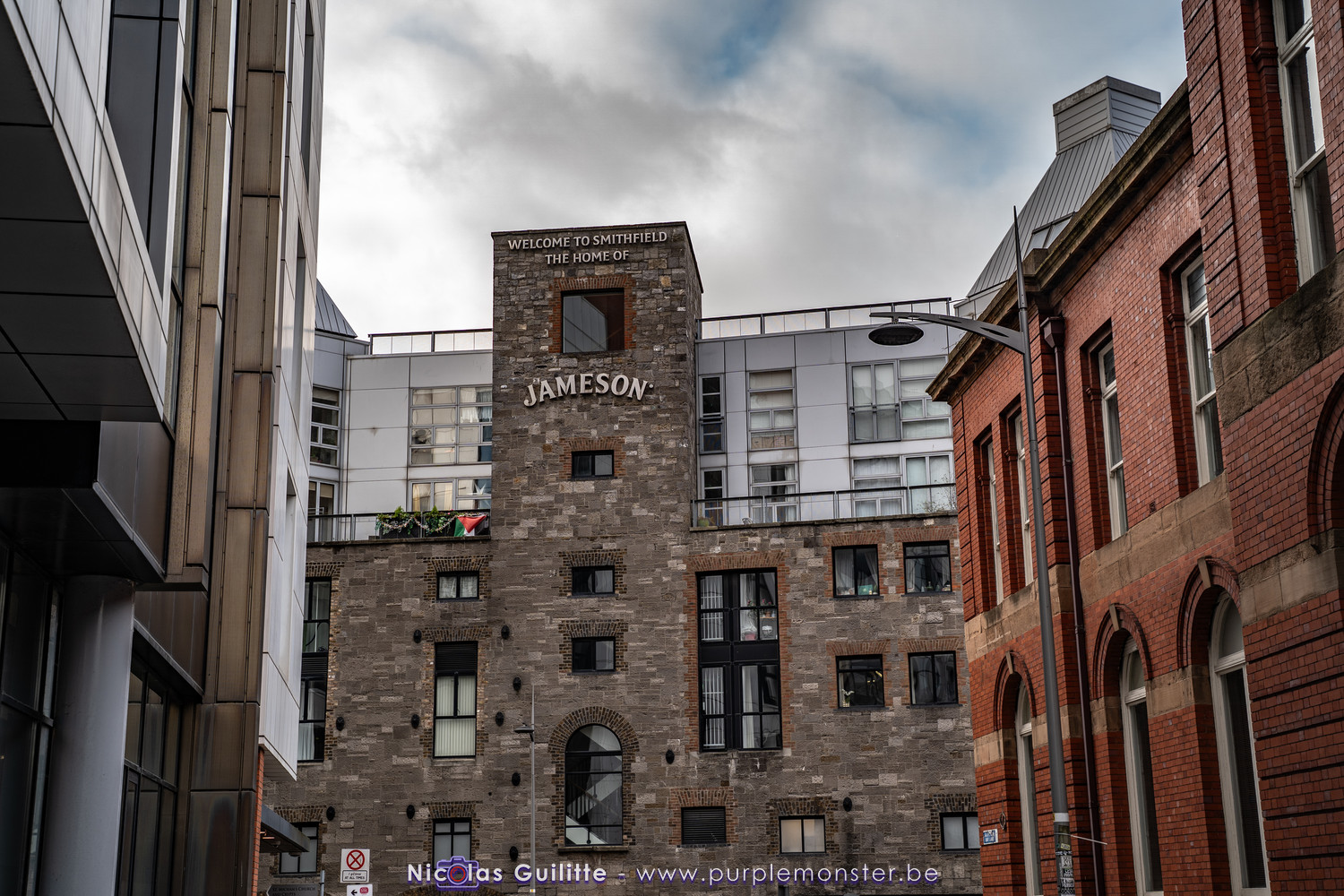 Au loin l'immense site de la brasserie Guinness, avec le double bar panoramique au sommet de l'ancien bâtiment.