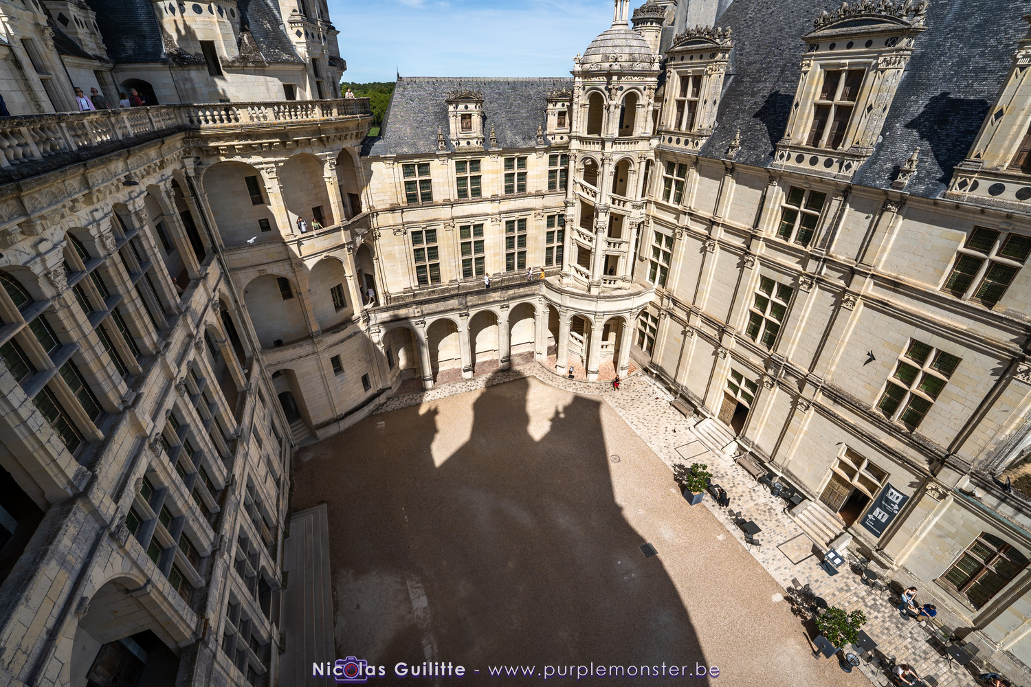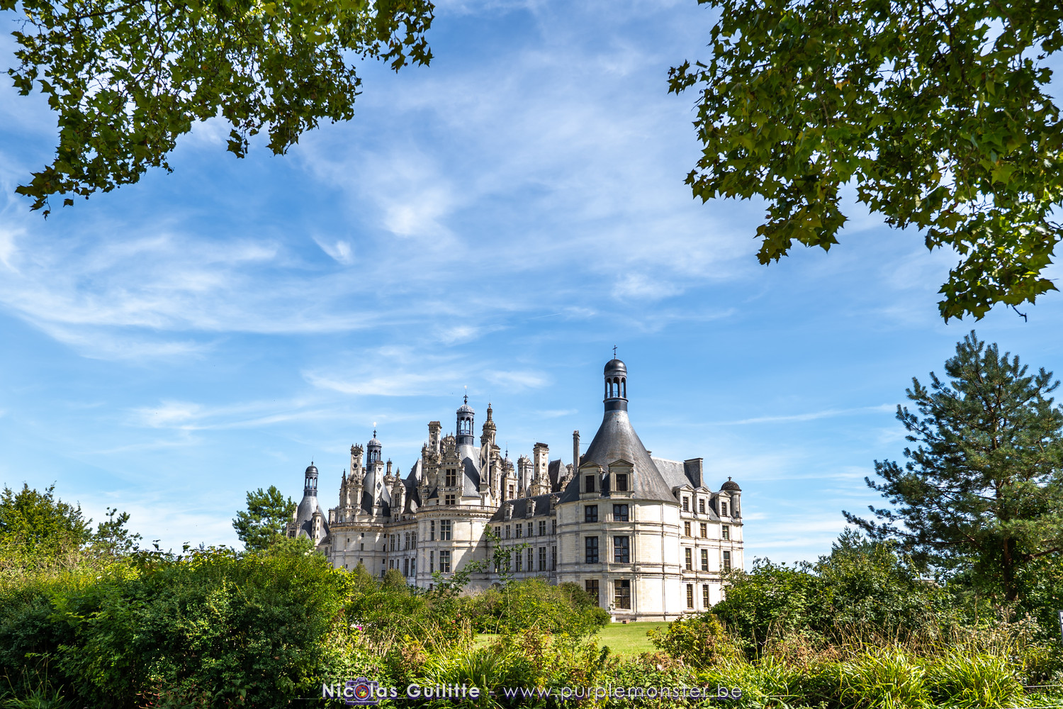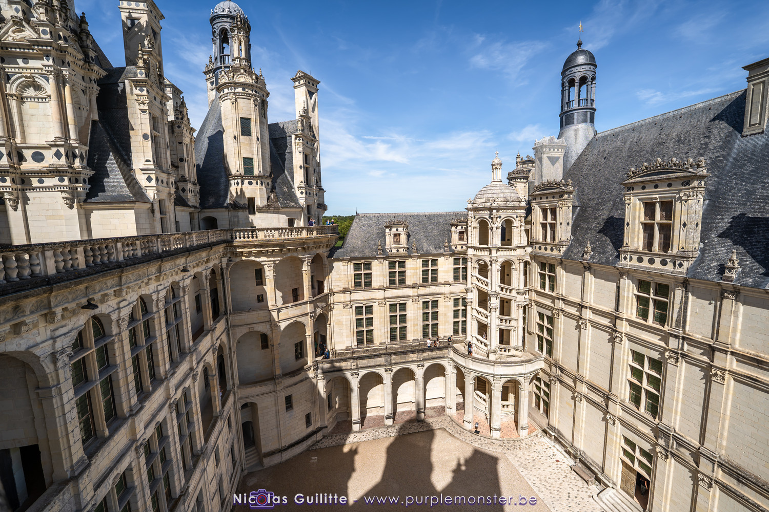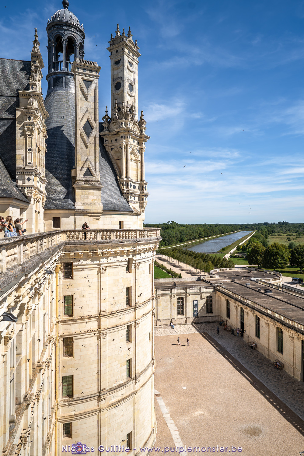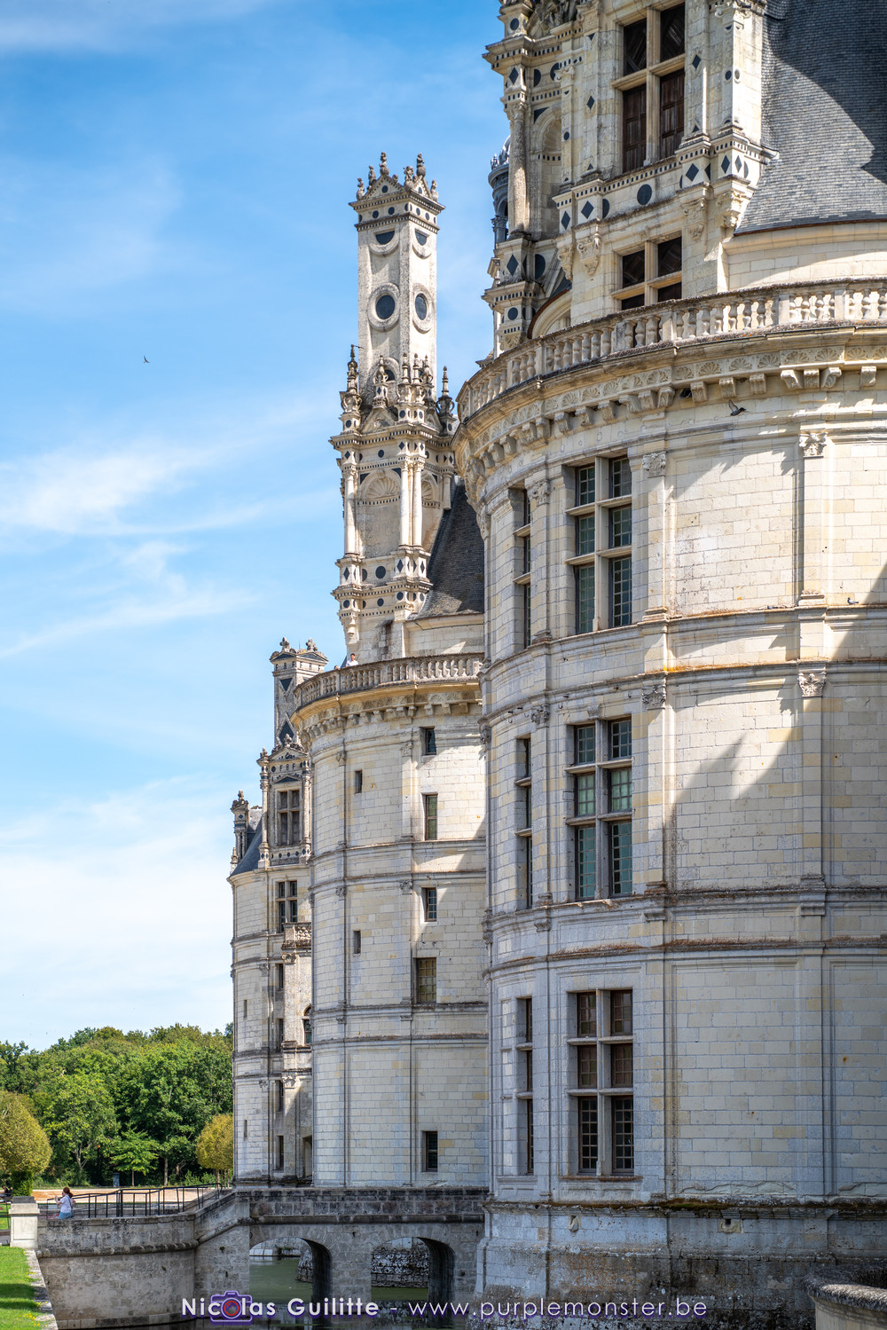 De passage dans la région pour la dernière édition des Nuits de Sologne, et au vu de la météo encore estivale, le moment était bien choisi pour faire un peu de tourisme local au château de Chambord tout proche, que j'avais déjà pu photographier en 2019 à travers un feu d'artifice pour son 500° anniversaire, mais que je n'avais jamais visité. Le moins que l'on puisse dire c'est qu'il est assez majestueux vu de l'extérieur, et un peu atypique de par ses nombreuses fenêtres et tourelles sur les toits. A première vue, tout paraît symétrique, mais quand on y prête attention, beaucoup de choses ne le sont pas, à commencer par les tourelles justement, mais aussi certaines fenêtres sur la façade centrale, ou encore la largeur des 2 ailes de part et d'autre de la partie centrale du chateau. Il paraît grand, mais on en fait assez vite le tour au final. Les différentes pièces intérieures s'articulant autour du double escalier central sont relativement grandes, mais tout se ressemble un peu et si on ne regarde pas par la fenêtre, c'est difficile de deviner de quel côté du chateau on se trouve.