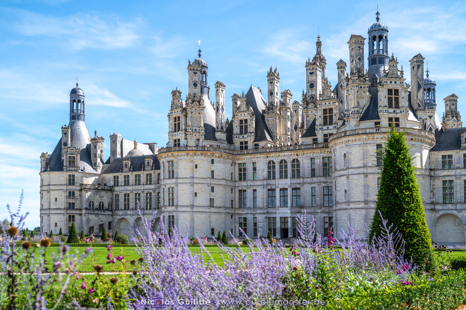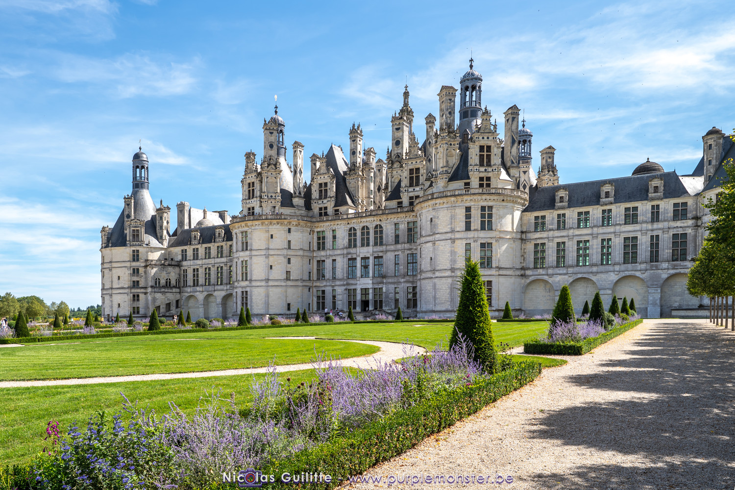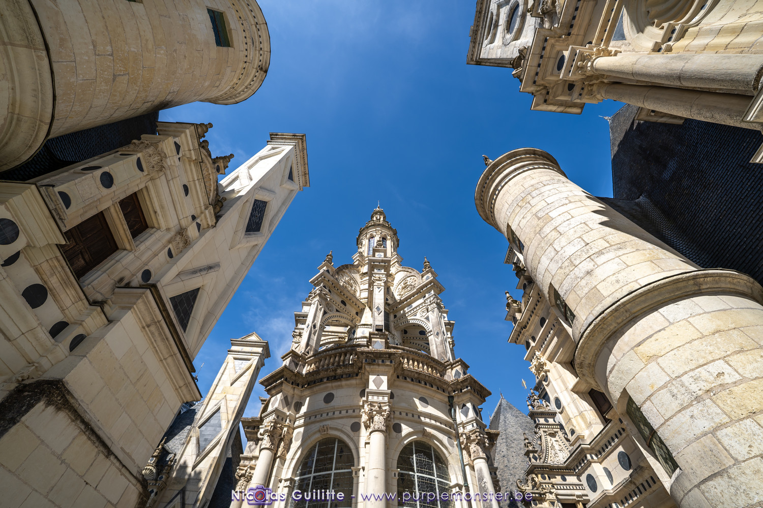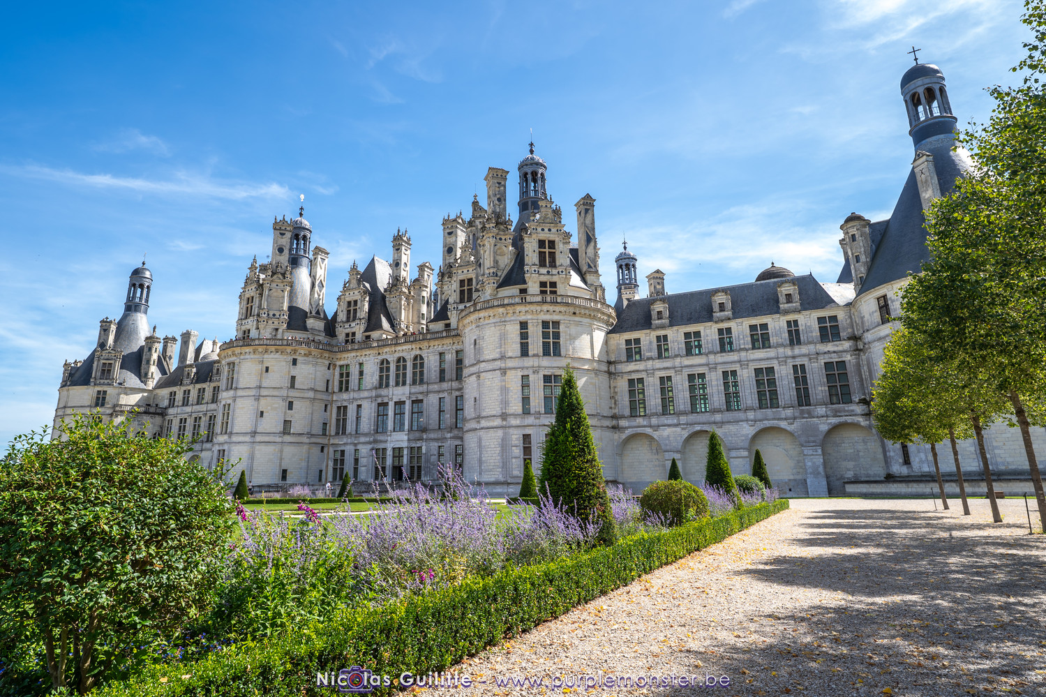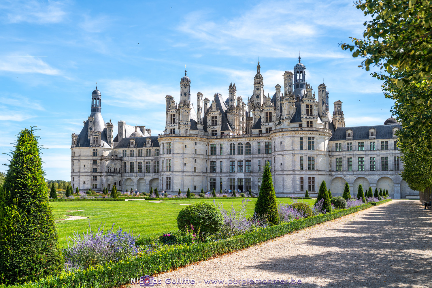 De passage dans la région pour la dernière édition des Nuits de Sologne, et au vu de la météo encore estivale, le moment était bien choisi pour faire un peu de tourisme local au château de Chambord tout proche, que j'avais déjà pu photographier en 2019 à travers un feu d'artifice pour son 500° anniversaire, mais que je n'avais jamais visité. Le moins que l'on puisse dire c'est qu'il est assez majestueux vu de l'extérieur, et un peu atypique de par ses nombreuses fenêtres et tourelles sur les toits. A première vue, tout paraît symétrique, mais quand on y prête attention, beaucoup de choses ne le sont pas, à commencer par les tourelles justement, mais aussi certaines fenêtres sur la façade centrale, ou encore la largeur des 2 ailes de part et d'autre de la partie centrale du chateau. Il paraît grand, mais on en fait assez vite le tour au final. Les différentes pièces intérieures s'articulant autour du double escalier central sont relativement grandes, mais tout se ressemble un peu et si on ne regarde pas par la fenêtre, c'est difficile de deviner de quel côté du chateau on se trouve.
